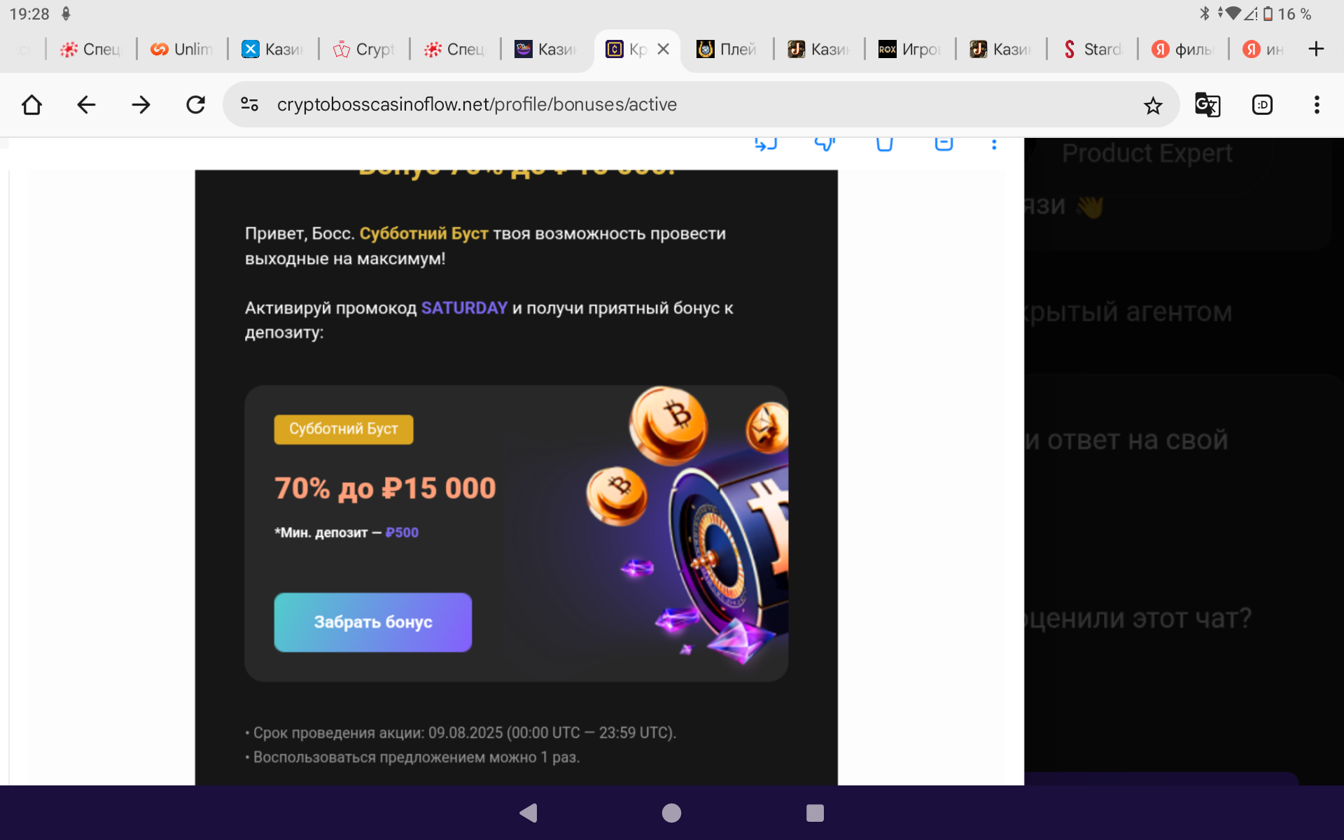Да, в криптобоссе от 500 руб 70% пишут! Хотя часто так пишут, а потом активируешь и там 70% окажется от 5000, а от 500 руб будет до 50%, ну 45 или 50. Мне не попробовать, отключен же от них!:((