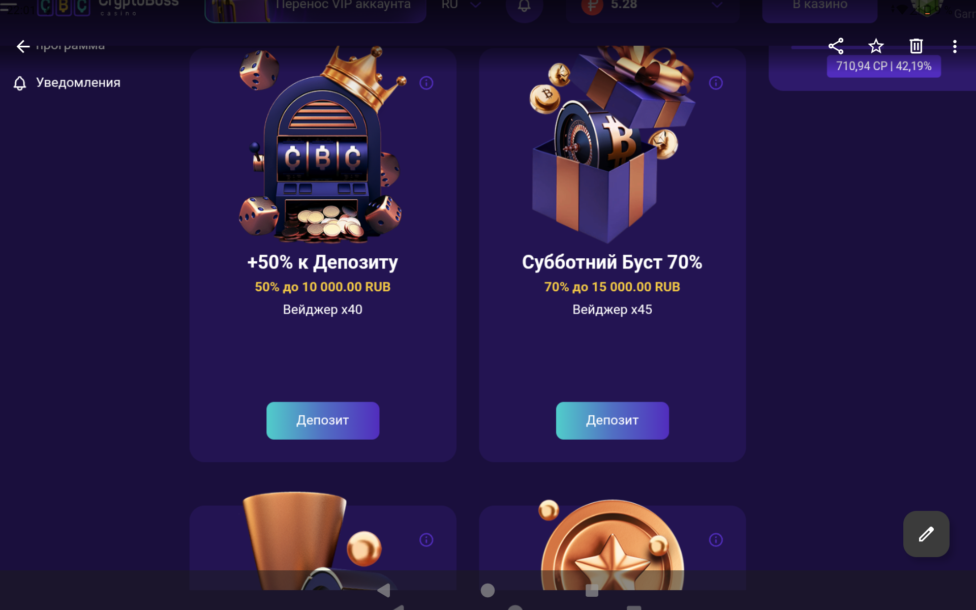 Криптобосс оч хороший Каз и также из всей сетки их соответственно тоже он как Флагман тоже хорош!Но скорее был!После начала проблем с картами и платежами по сбп и номерам карт сетка и собственно сам криптобосс потеряли львиную долю своих игроков ,а новых приобрести в наше время практически невозможно при текущем положении дел в мире,серьёзнейшей конкуренции и т.д.Соответственно КБ закрутили гайки до невозможности и казя перестала давать Игру ,выиграть там стало проблематично или попросту невозможно!!!Несмотря на то,что у них100% лицензионный слоты и великолепнейшая служба технической поддержки,ну а то,что КБ и вся их сетка четко платит в этом ни у кого сомнений нет,я прекратил из посещать так как оно не имеет смысла более! Криптобосс зачётное он лайн казино во всех отношениях, но выиграть у них более не представляется возможным,впрочем как и в других он лайн казино которые ориентированных на рунет и русскоязычных игроков!