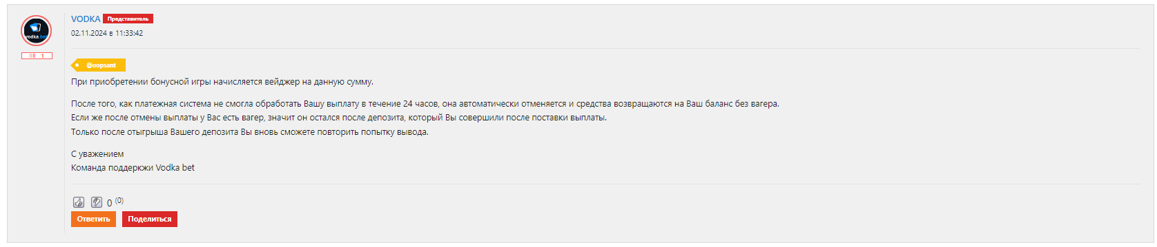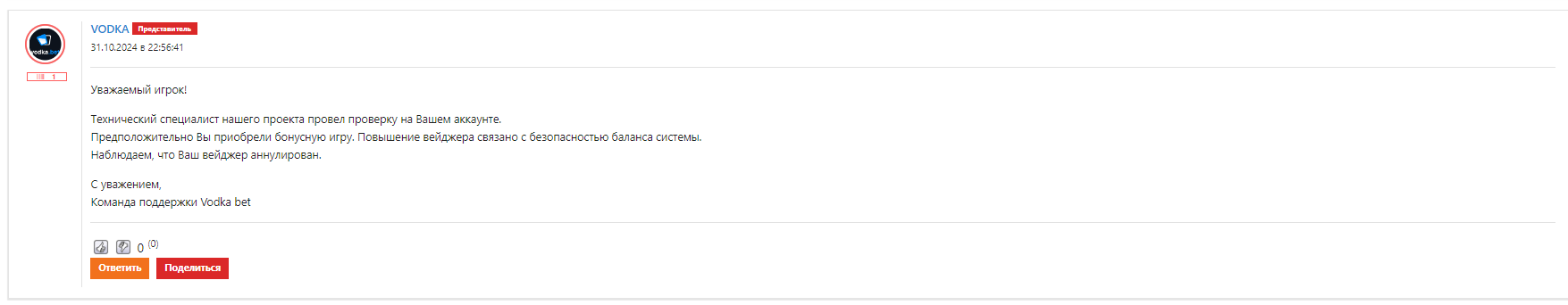 Это ответ на мою жалобу по вейджеру который накидывают не понятно за что. Кто может мне обьяснить что менеджер водки имеет введу? я вот сижу голову ломаю и не понимаю) Какая бонусная игра покупная может накинуть вейджер на отмененный вывод если при этом все игры были завершенны а баланс был 0?) может кто шарит я не знаю)