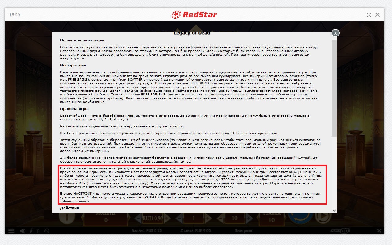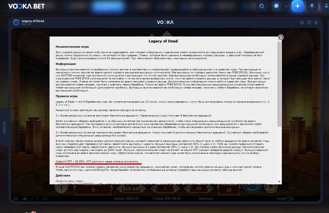 @inkgra84 Да во всех казино крутят и с волатильностью и с РТП. Вот, например, берем провайдер ПНГ, любой популярный слот, пусть «Легаси» и смотрим в «Водке» указан РТП — 96,58%. Да, возможно это обман и реальный РТП не такой. А вот во всем известном и старом казино «Редстар» они просто убрали этот абзац и РТП не указывают. Странно, правда? Если ты честное казино, укажи какой у тебя стоит РТП! Делаю вывод, что «Редстар» просто крутит РТП периодически, потому и решили не указывать или выставили минимально возможный в 84%, тем более, что ПНГ предоставляет такую возможность официально выставлять РТП от 84% до 96%. Так, что о какой честности можно вести речь в игровом бизнесе!