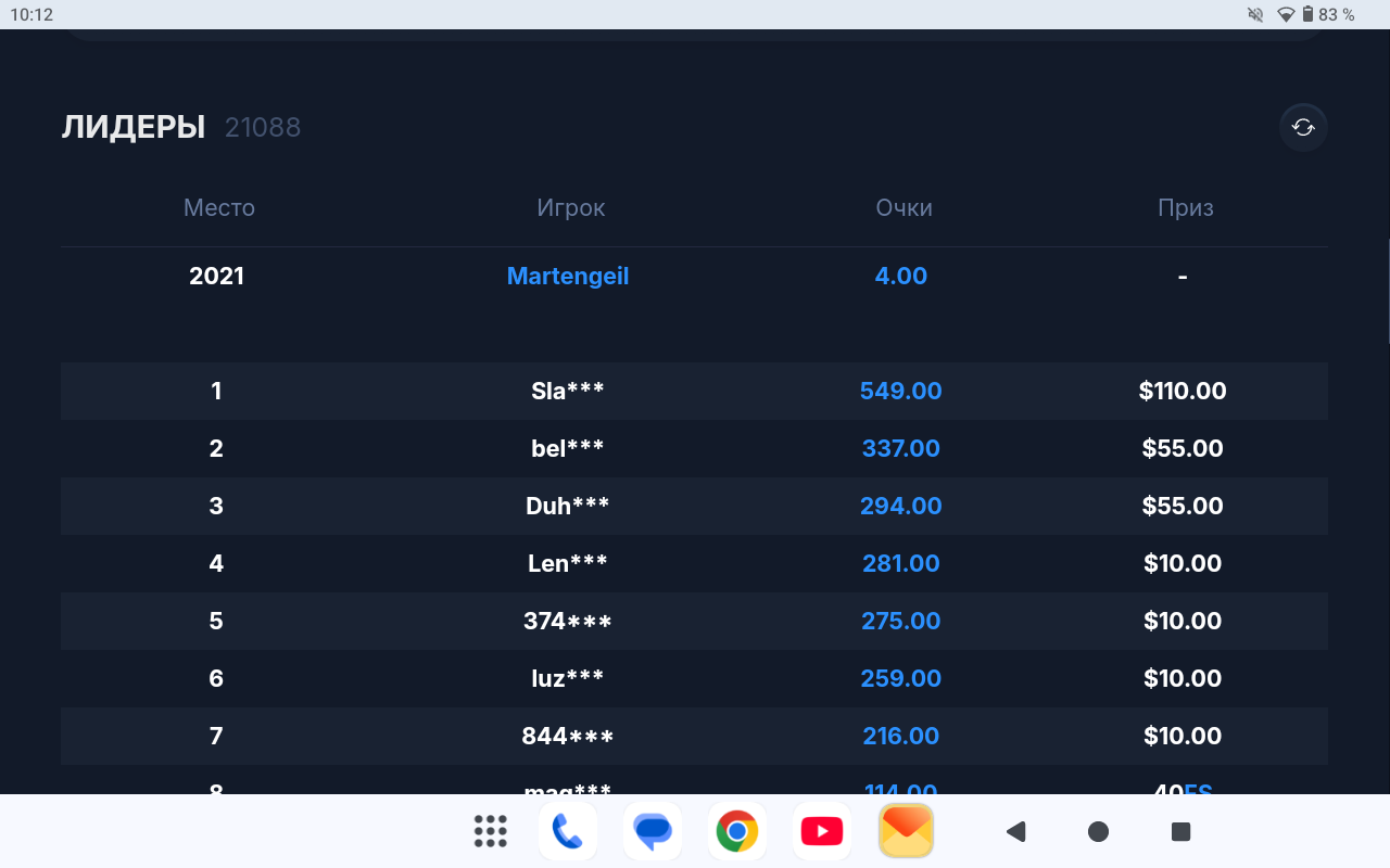 Вчера снова был турнир на максимальное количество плюсовых ставок подряд. И как я заметил, что у чела 1000 ставок подряд плюсовых следил за ним. Человека не было где-то до +-18:00 по мск (турнир идёт до 21:00). Подумал, ну видимо не каждый раз, сегодня захожу проверить результаты и что думаете? Нарисовался этот чел снова под самый значит конец турнира и сделал в этот раз скромные 500 плюсовых ставок в ряд.