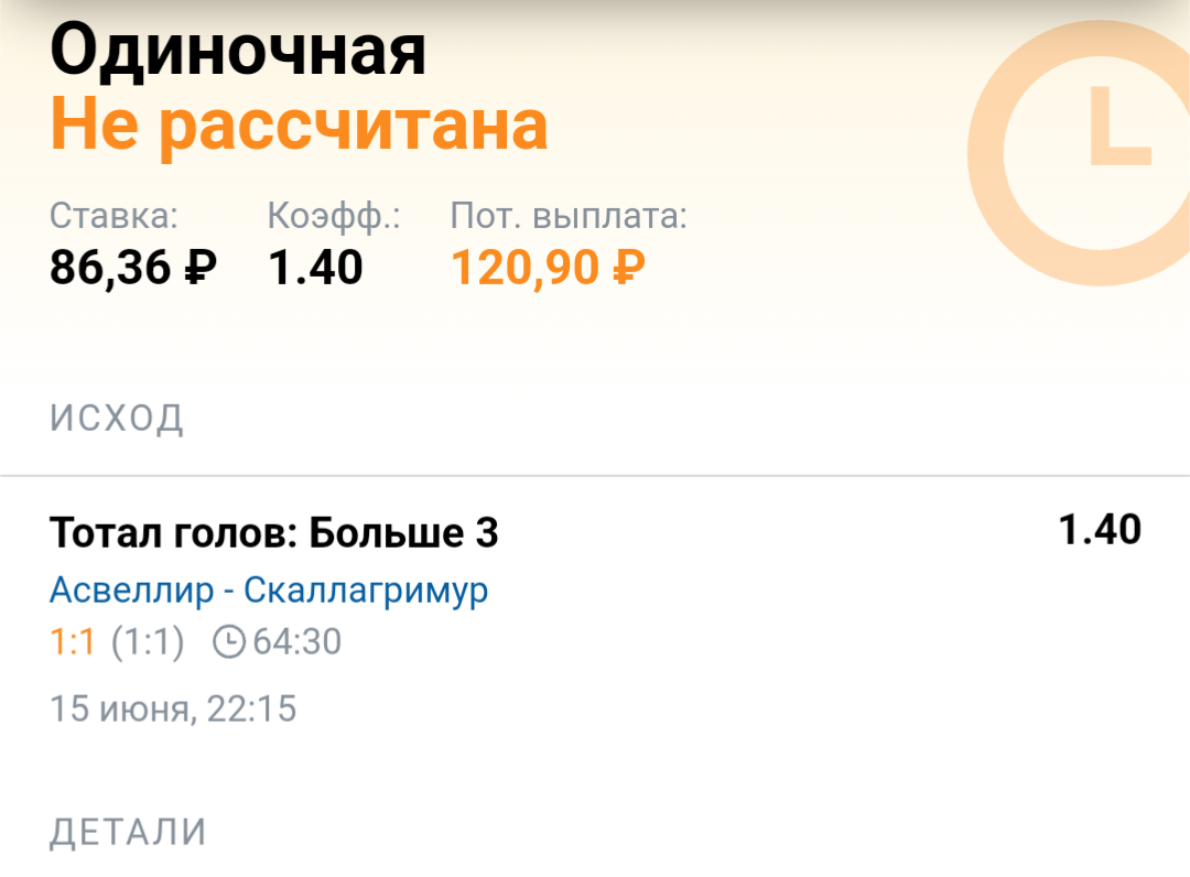 Шестая ступень по Live, возьмём гол П2 в перерыве при счёте 1-0 . В первом тайме не плохо так играли, была мысль их победу с форой(0) взять , но П1 опередила закинув голец , поэтому попробуем заиграть просто гол П2 за 1.43 на второй тайм.