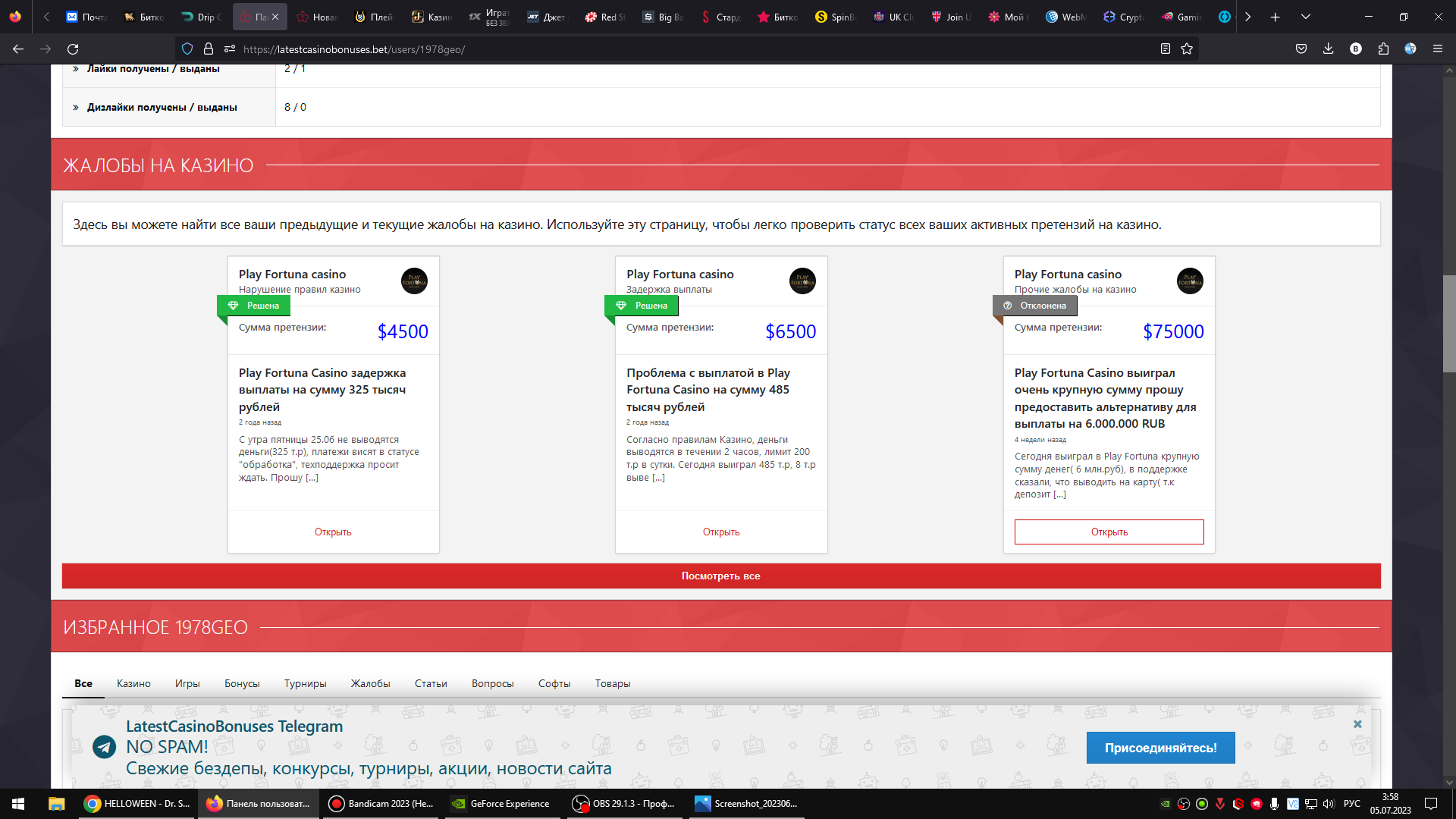 Ну а посмотрев профиль жалобщика я стопроцентно убедился,что профиль этот с админки самой Плейфортунки и они сами себя так сказать пиарят(можно так выражусь)))ха-ха-ха) т.к данная личность третий раз выигрывает очень много денег и ему их почему-то то морозят то не платят непонятно почему!)))Что -что но выводы оборзевшие от безнаказанности граждане с Плейфортуны никогда никому не морозят и не кидают,тут уж надо отдать им должное и всегда все всем выводят.