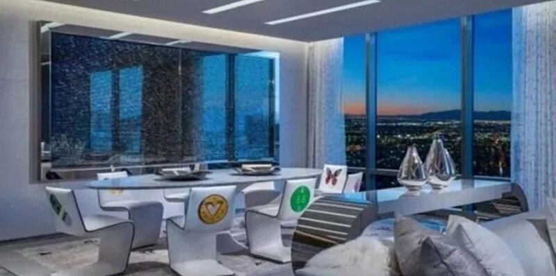 Вы также сможете насладиться частным кинотеатром, 13-местным баром, гостиной, достаточно большой для более чем 50 гостей, и столовой. Есть даже большой частный бассейн со стеклянными стенами с потрясающим видом на город грехов.