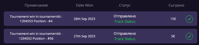 вот крайний выигрыш в FTN турнирах, сначало 5 евро и 28 сентября 15 евро