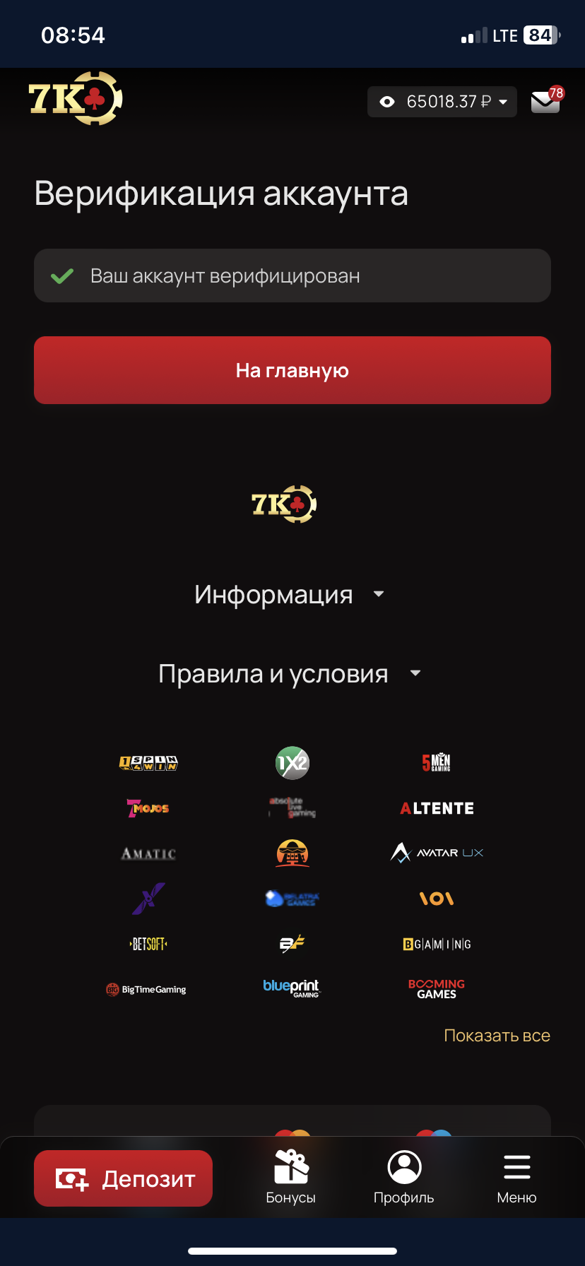 аккаунт был верифицирован! Потом запросили по почте дополнение к данным ! Теперь и вовсе игнорят и нет гарантии что вообще получу свой выигрыш! Увы и Ах! Ненадёжный клуб по выплате ! Не советую играть в 7 К casino