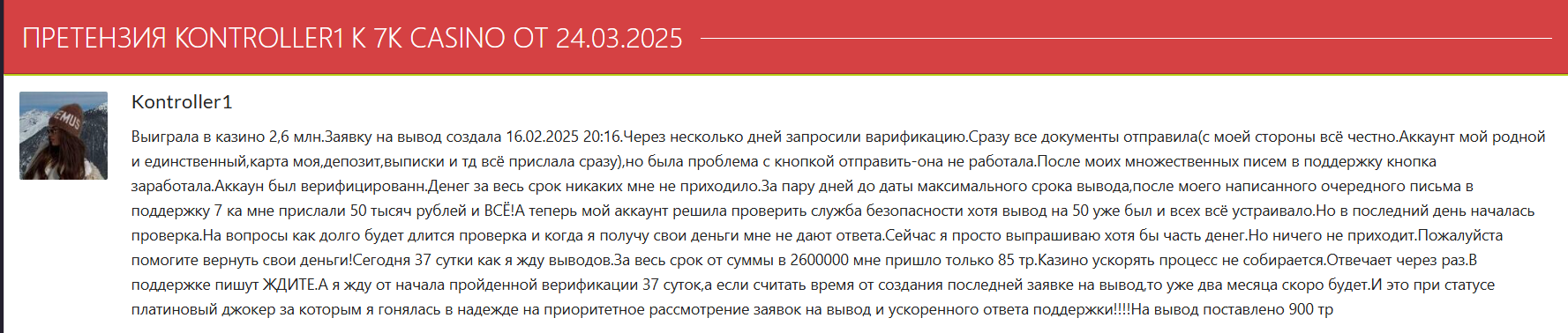 Это приятная штука, что люди сначала идут проверять что там по жалобам. а уже потом приходит осознание, что ваш Гавнютин, рекламирует шлак и уже даже не стесняется брать деньги от такого дна как 7к. Ваши проблемы с казино он тоже решать не будет, надеюсь это тоже понятно.