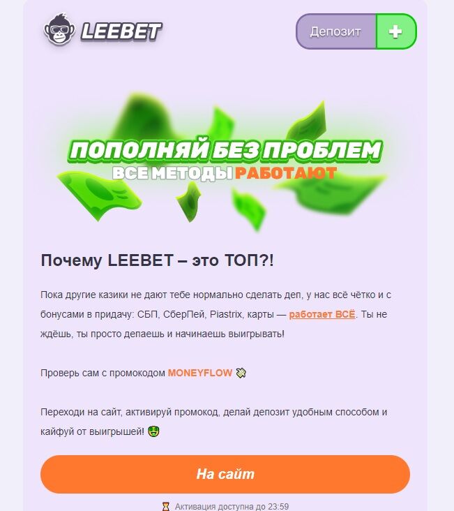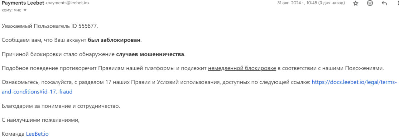 Сделал регистрацию в казино LeeBet от стримера ALEXCAS. В рекламе было сказано, что казино без верификации. Сделал первый депозит криптой около 15-20$ точно не могу сказать с бонусом от ALEXCAS. Получил средства на бонусный счёт и фриспины. Отыграл вагер х60 на общую сумму более 1500$. При выводе средств запросили пройти верификацию. Отправил фото паспорта, селфи с паспортом, но не было возможности подтвердить адрес проживания. (казино без верификации). Ещё немного поиграл, опять поставил на вывод, сразу отказ. Несколько дней не заходил, а потом пришло письмо от казино LeeBet, прикрепил ниже к посту, с инфой что меня заблокировали ссылаясь на пункт 17 (мошенничество). В письме не затребовали никаких подтверждений и тд. Просто заблокировали аккаунт и не вернули средства. Ответил на почту казино, о способе восстановления аккаунта и возврата средст, никто не отвечает.