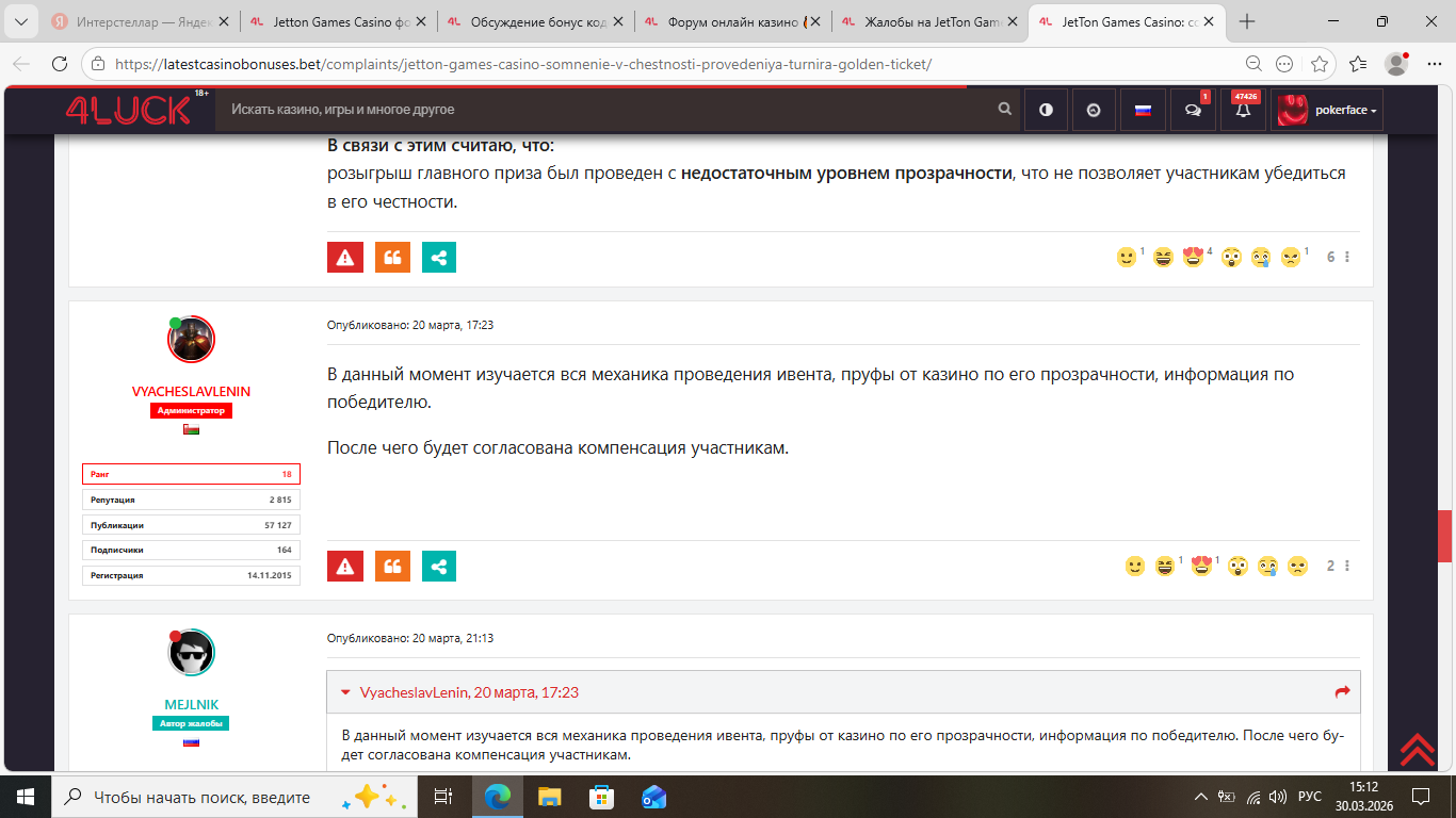 @h00ya так и есть, прочти все жалобы, поданные по тому розыгрышу, конкурсу, одна вода, ответы от преда ту по шаблонная «лапша». Хз, за кого они нас держат, чтобы в это поверить.. Слава, как я понял, изучает видео, стрим конкурса, и в случае нарушения, подтверждения всех изложенных фактов форумчан, что он был разыгран не честно, мягко говоря, первое призовое место, как я понял, будет компенсация. Сам слежу за парой жалоб, в случае удовлетворительного решения сам напишу и потребую 140$ на потраченные билеты, этого не до конкурса..