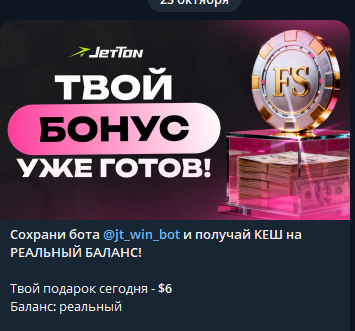@galy1959 да вроде всё норм. Сначала на JetTon Lucky промокод прислали, активировал, перешёл на новый бот