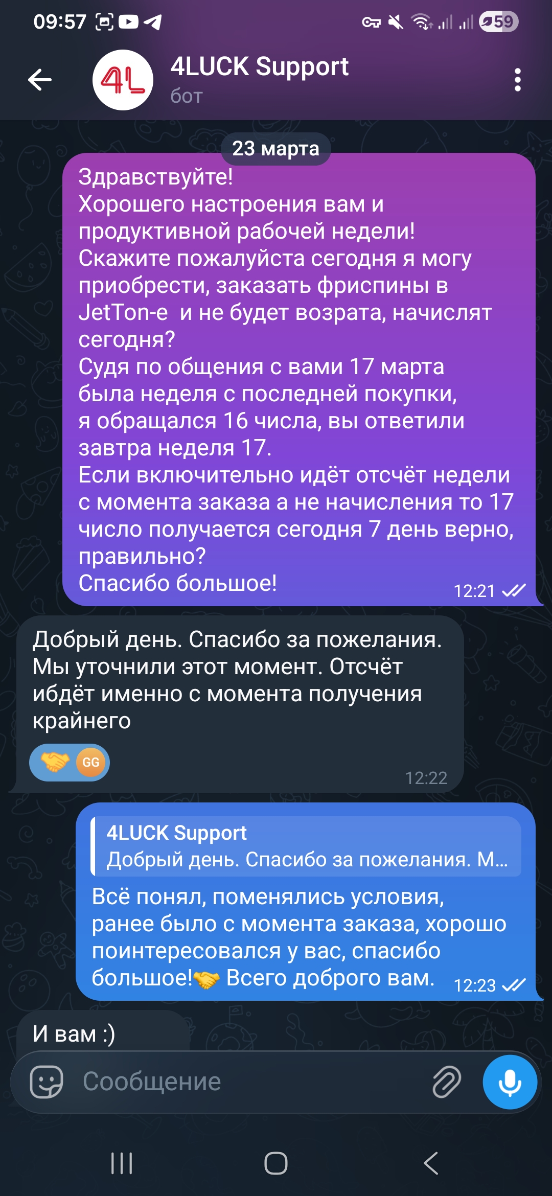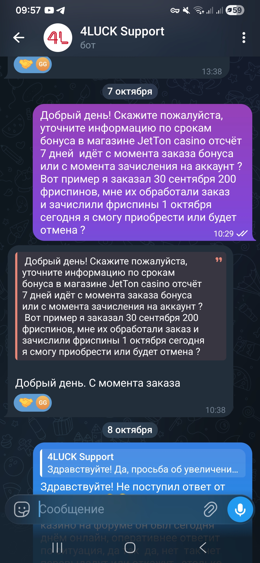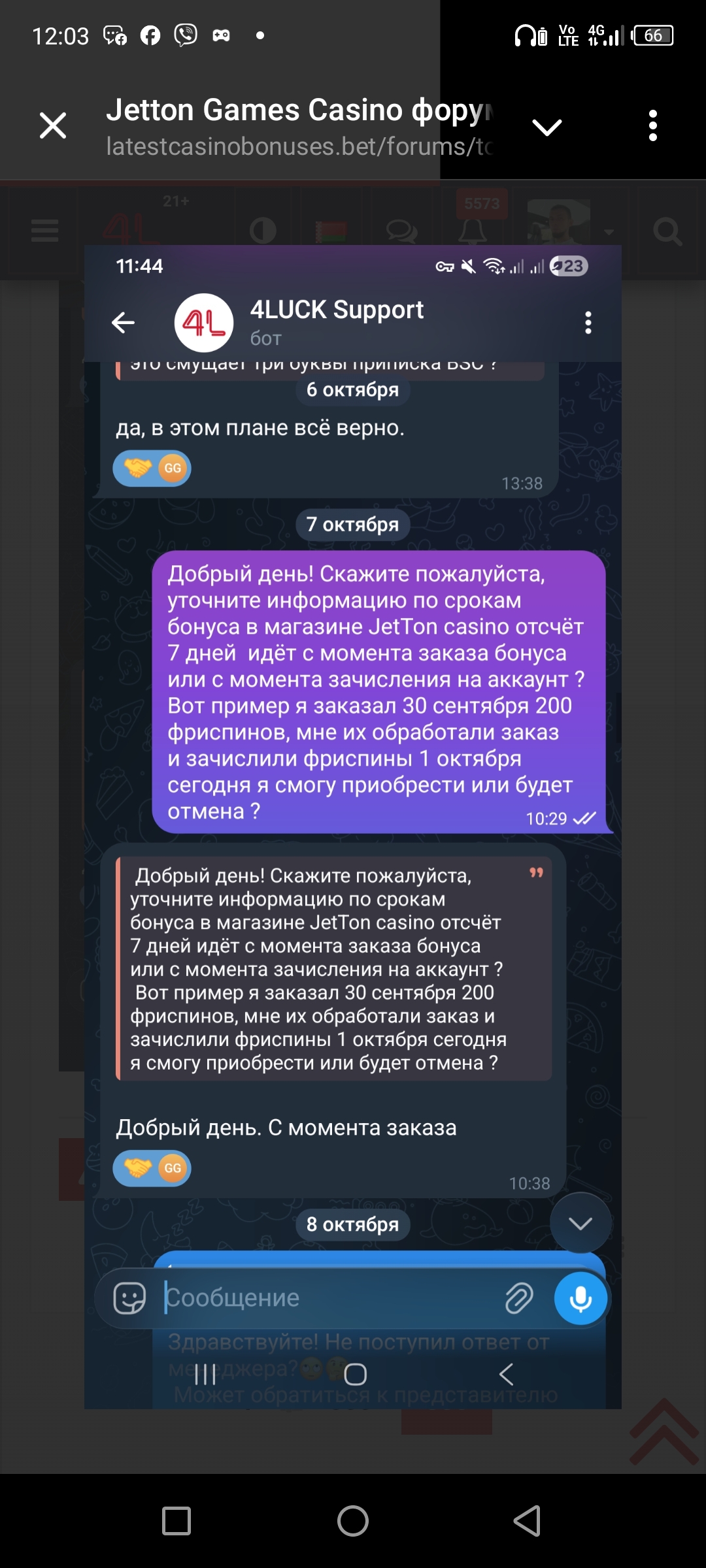Кстати, мне вчера ответили в тг боте поддержки латеста, что теперь отсчёт идёт 7 дней не с момента заказа, а с момента начисления фриспинов на акк.