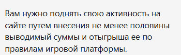 «Вам нужно поднять свою активность на сайте путем внесения не менее половины выводимый суммы и отыгрыша ее по правилам игровой платформы.».