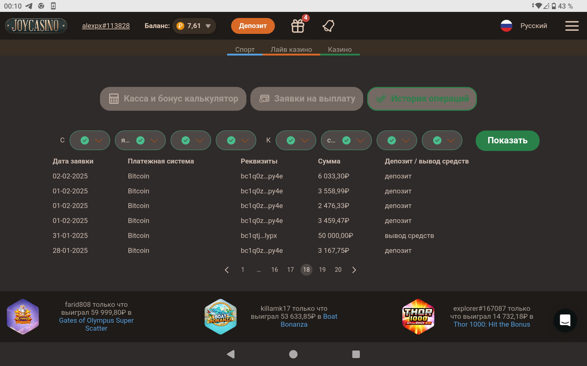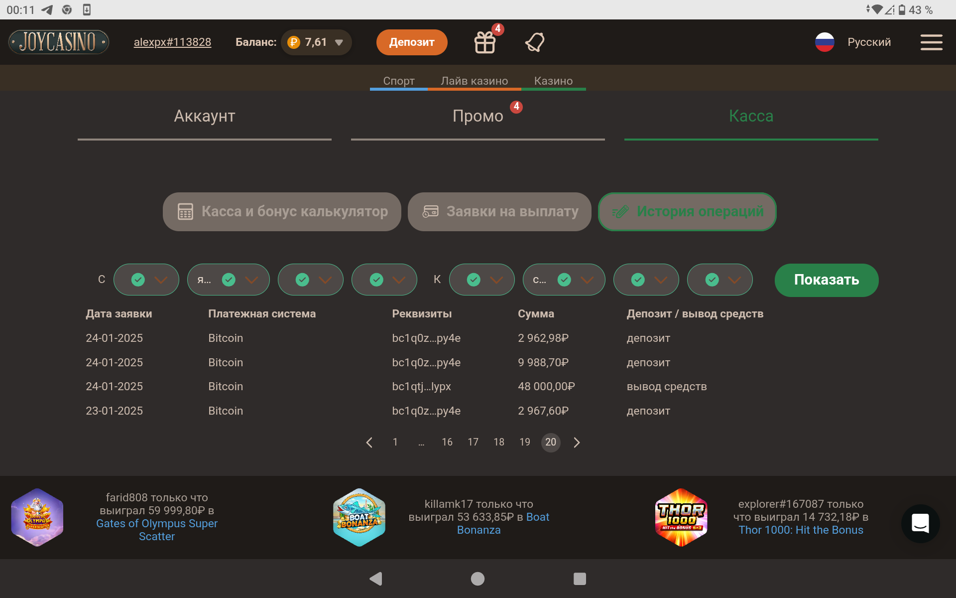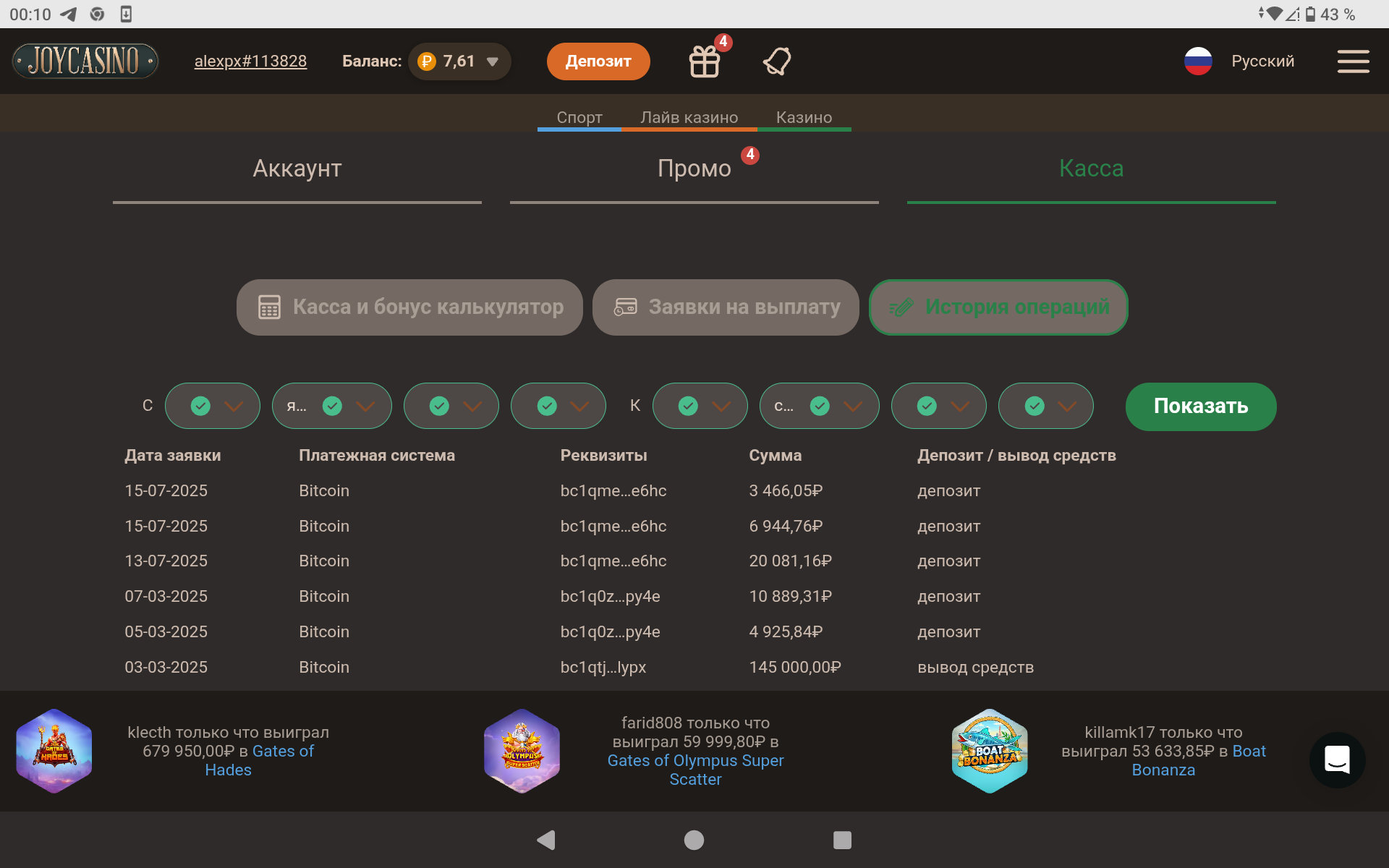 выводил по частям в течении 2-месяцев,додепывая по мелочи под бонусные и продолжая играть,все сразу не рекомендую выводить,сразу отдачу скрутят(что потом собственно и сделали в Джое). ))))Более Никак и никогда не удавалось продавить выигрыш,систем тут же сливала в ноль в любой слот и любой стол лайва.Оч надеюсь @bugulma83,что именно Вы выигрывали 800 к и даже Больше в он лайне!Я просто уверен в этом!Рад за Вас от чистого сердца!