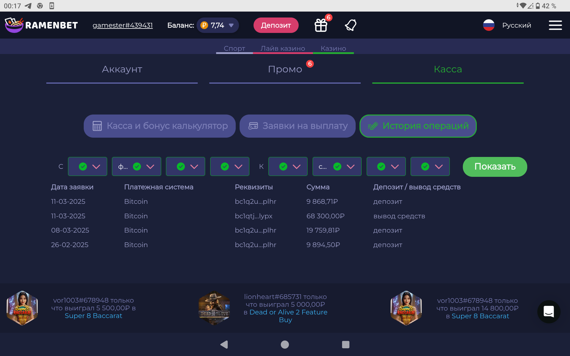 Бывало года два три назад тоже вывел около 100т.р. в джое и действительно отдачу отрезало как по заказу, после этого случая жду недельку две после вывода чтобы поиграть в казино, думаю в рамене тоже самое будет