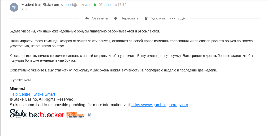 Жаль конечно, что Стейк выйдя на российский рынок более активно в этом и том году — так как стримы на Kick теперь смотрят больше людей, начинает соответствовать нашим Котам и Роялам. Жалобу писать не стал, смысла не вижу — поддержка ответит что и ответила мне. Только вопрос, что будет дальше если теперь и забугорные казино начинают вести себя подобно сетки Котов, Роялов… А что, люди все равно продолжают играть, одни начали другие подхватили.