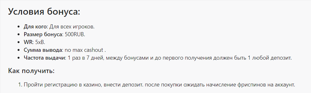 1 раз в семь дней это частота выдачи, а про депозит за 7 дней ничего не сказано. Депозит между бонусами был более 1-го «любого».