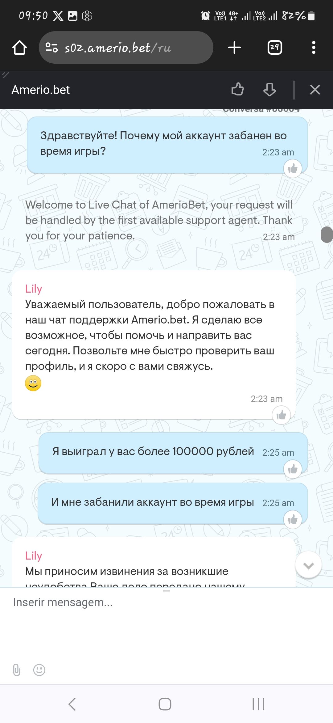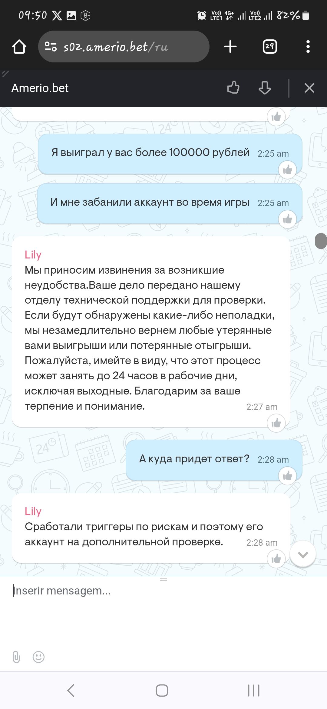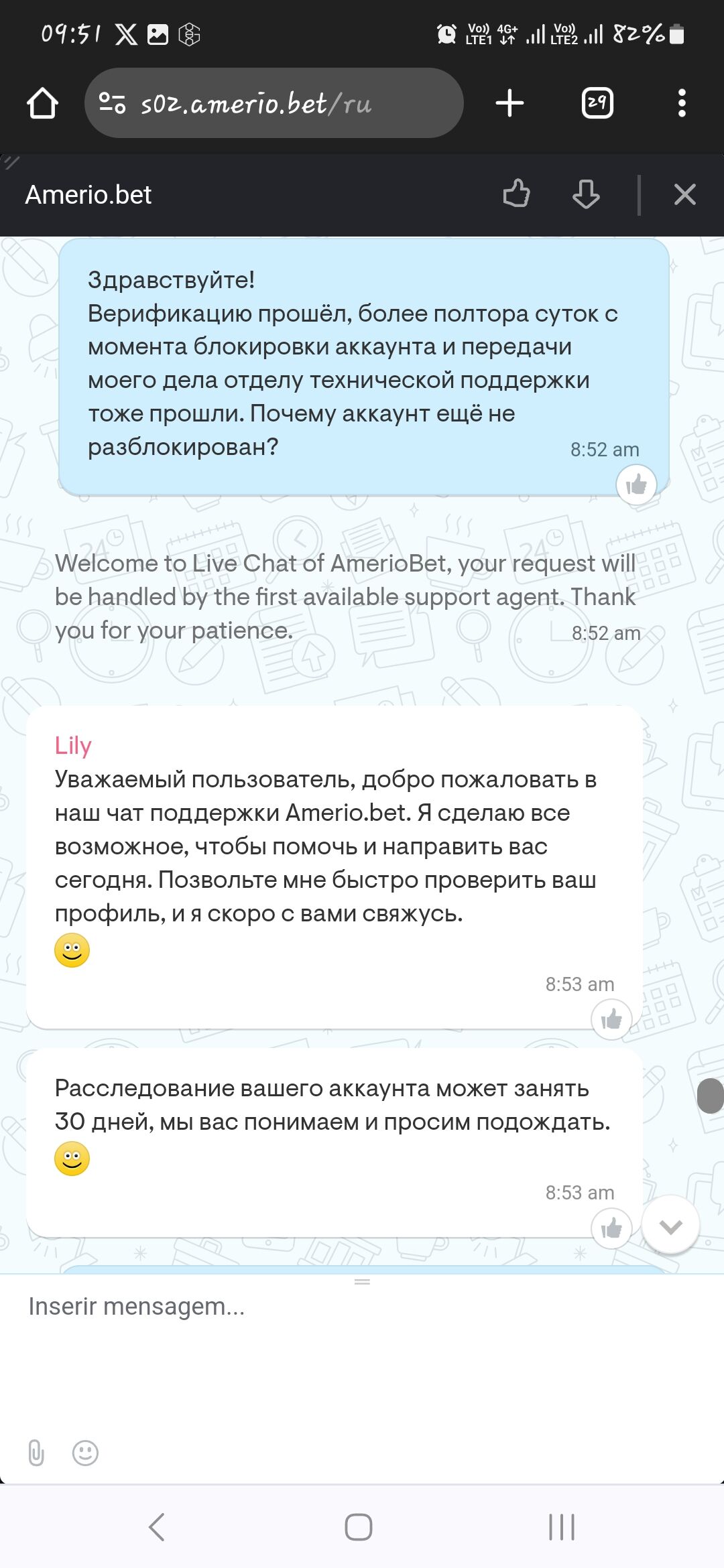 10.04.24 в 1.12 пополнил депозит в usdt trc-20 32.56$ (3000р) в казино amerio.bet, выиграл более 100000 рублей и прямо во время игры был заблокирован мой аккаунт. На аккаунте была пройдена верификация по 4 документам. Незамедлительно написал в техподдержку. Техподдержка объяснила блокировку тем, что сработали какие-то «триггеры безопасности» и попросила подождать 24 часа для проверки, всю переписку приложил. Прошло 24 часа, техподдержка попросила пройти дополнительную верификацию с листочком с названием казино, документом и открытым терминалом (чатом). Отправил документы на почту саппорта казино, через пару часов пришло письмо на почту, что дополнительная верификация пройдена, но аккаунт не был разбанен и зайти в личный кабинет казино я опять не могу (до этого казино один раз уже блокировало мой аккаунт, также были проблемы с выводом средств). Написал опять в техподдержку, теперь техподдержка просит подождать уже 30 дней, ничем не мотивируя, казино просто тянет время и не хочет разблокировать аккаунт и выплачивать средства. Прошу представителя казино разобраться с блокировкой моего аккаунта. Не рекомендую выбирать данное казино для игры, если конечно же вы не хотите сталкиваться с подобными блокировками, проблемами и затягиванием времени.![]()