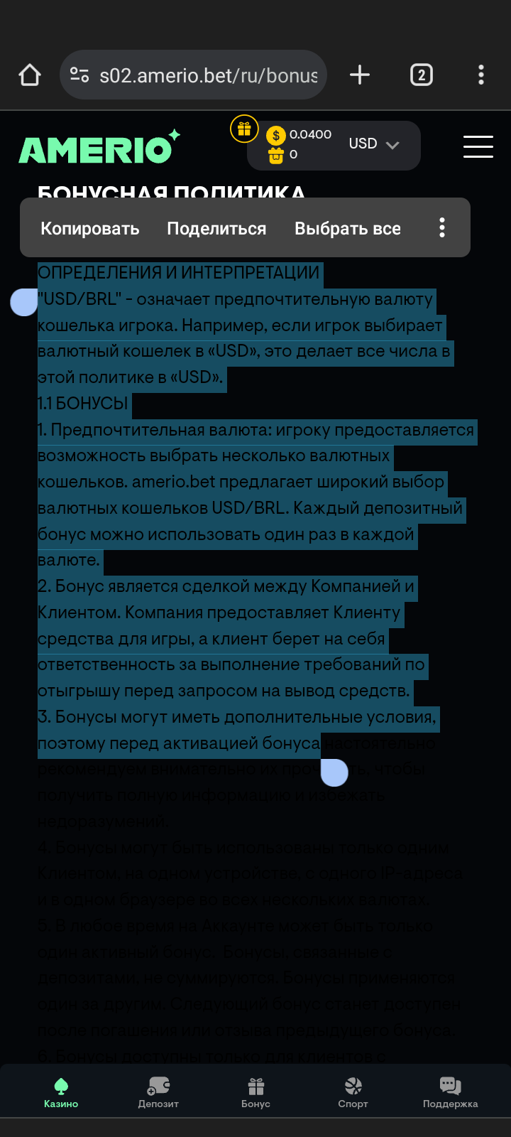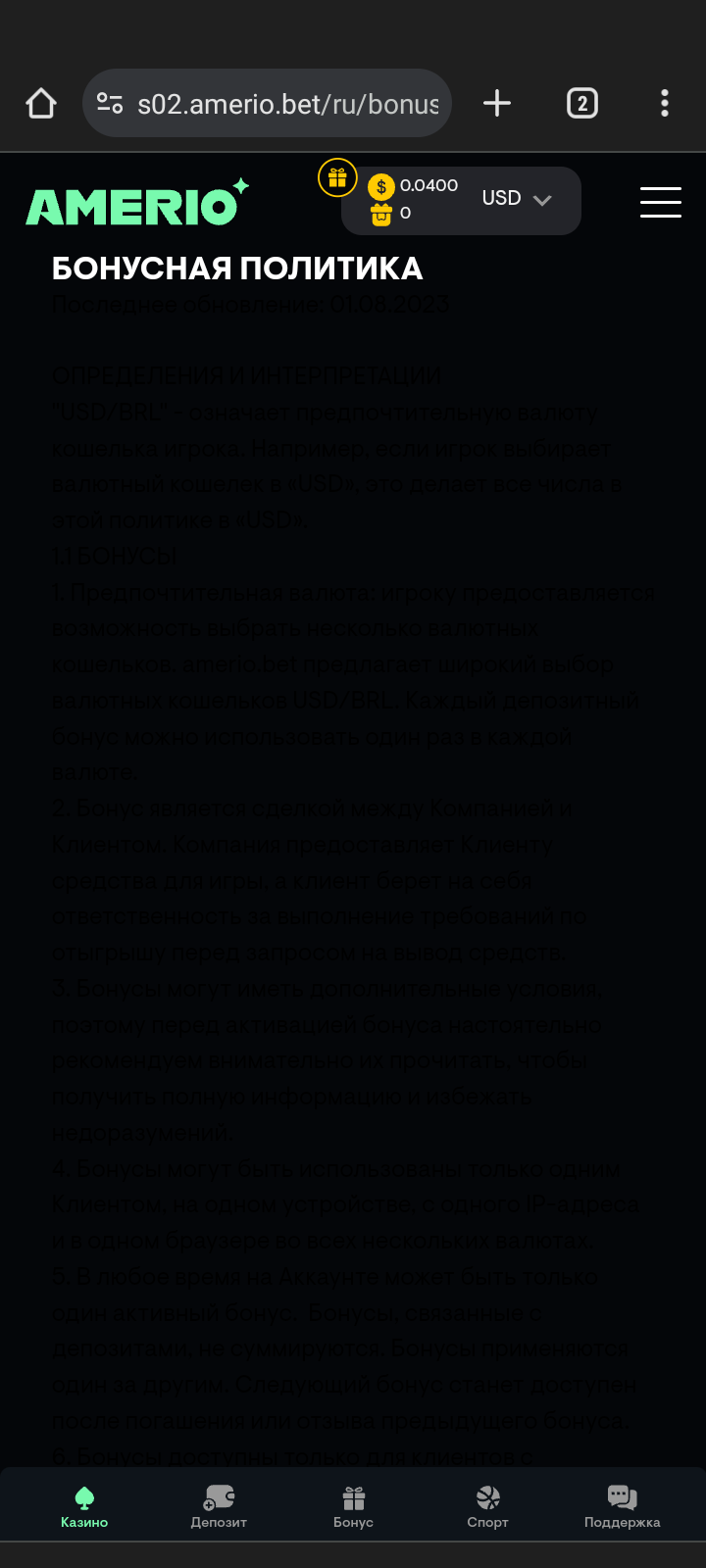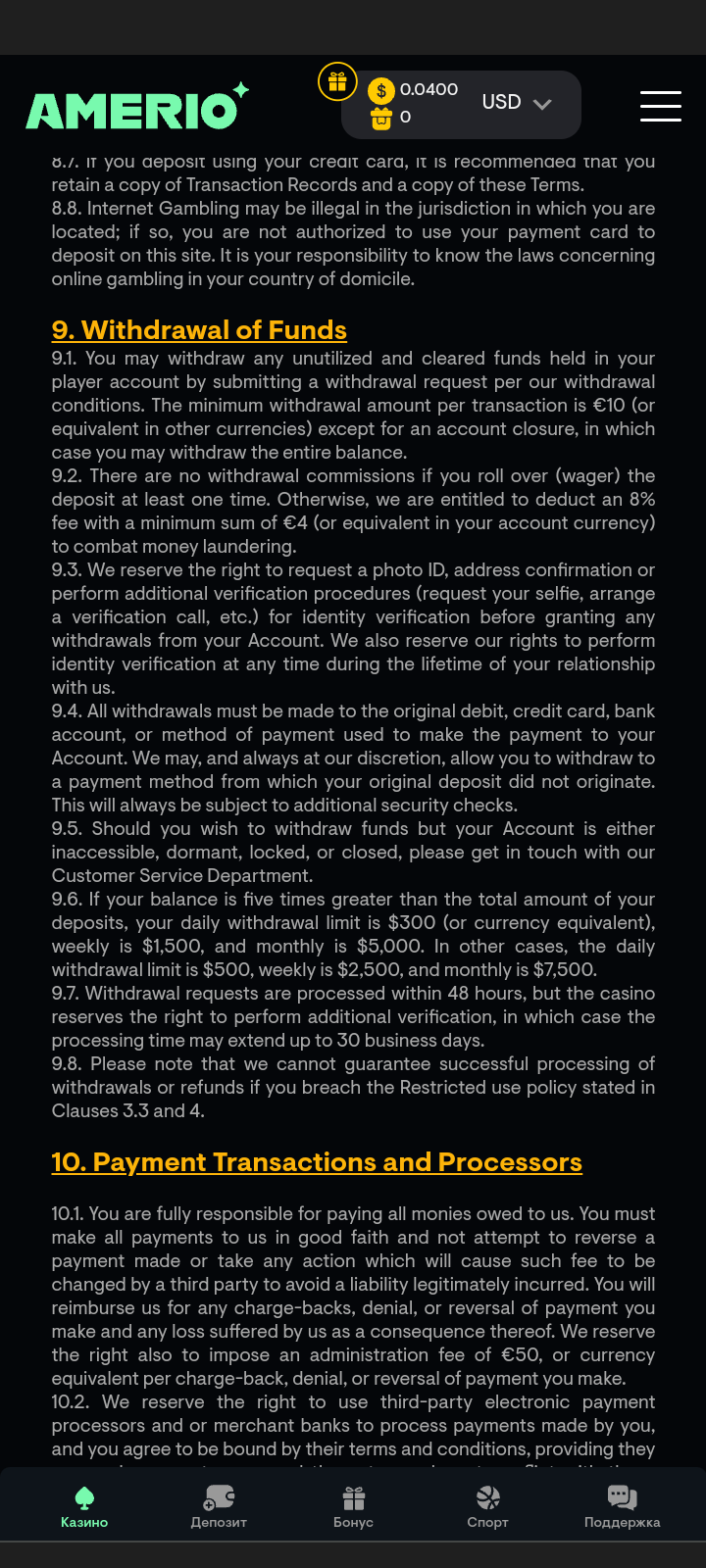 10.04.24 в 1.12 пополнил депозит в usdt trc-20 32.56$ (3000р) в казино amerio.bet, выиграл более 100000 рублей и прямо во время игры был заблокирован мой аккаунт. На аккаунте была пройдена верификация по 4 документам. Незамедлительно написал в техподдержку. Техподдержка объяснила блокировку тем, что сработали какие-то «триггеры безопасности» и попросила подождать 24 часа для проверки, всю переписку приложил. Прошло 24 часа, техподдержка попросила пройти дополнительную верификацию с листочком с названием казино, документом и открытым терминалом (чатом). Отправил документы на почту саппорта казино, через пару часов пришло письмо на почту, что дополнительная верификация пройдена, но аккаунт не был разбанен и зайти в личный кабинет казино я опять не могу (до этого казино один раз уже блокировало мой аккаунт, также были проблемы с выводом средств). Написал опять в техподдержку, теперь техподдержка просит подождать уже 30 дней, ничем не мотивируя, казино просто тянет время и не хочет разблокировать аккаунт и выплачивать средства. Прошу представителя казино разобраться с блокировкой моего аккаунта. Не рекомендую выбирать данное казино для игры, если конечно же вы не хотите сталкиваться с подобными блокировками, проблемами и затягиванием времени.![]()