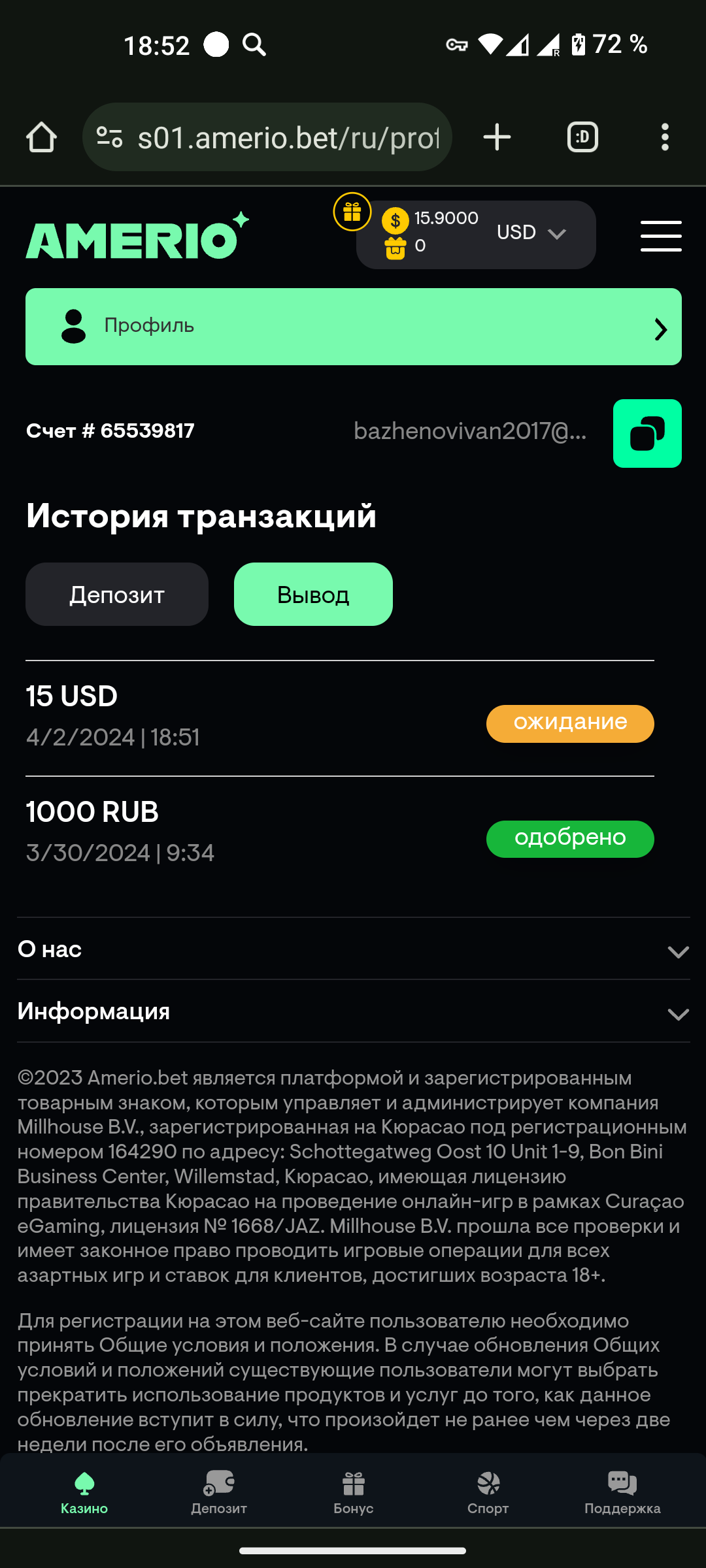 Уважаемый предоставить казино Amerio,поспособствуйте пожалуйста,чтоб отменили неправильную заявку на вывод