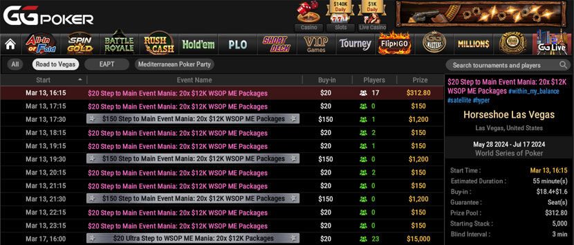 Степ-сателлиты на GGPoker проводятся в течение всего дня. Пока что минимальный бай-ин составляет $20, но ожидается, что в ближайшие дни рум сделает отборочные турниры еще более доступными — за $1.