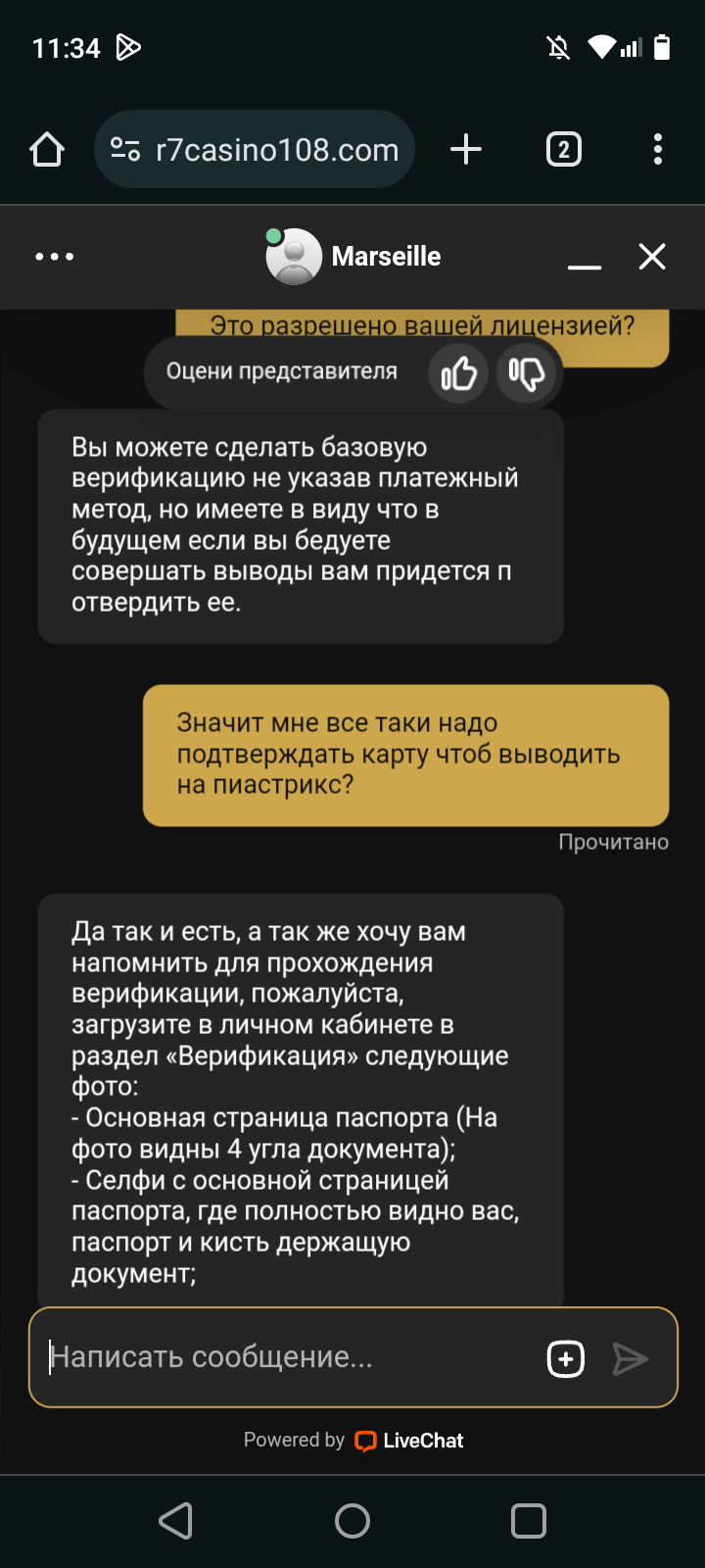 Решил я значит пройти верификацию в р7 (до этого загружал документы несколько месяцев назад, но мне почему отменили паспорт и селфи). Делал депозиты только с пиастрикс, карты не использовал.