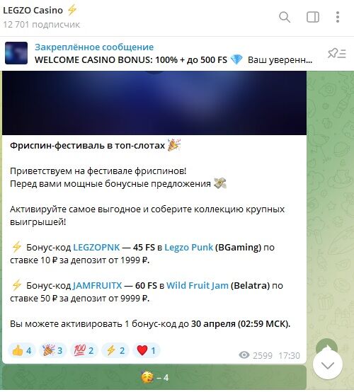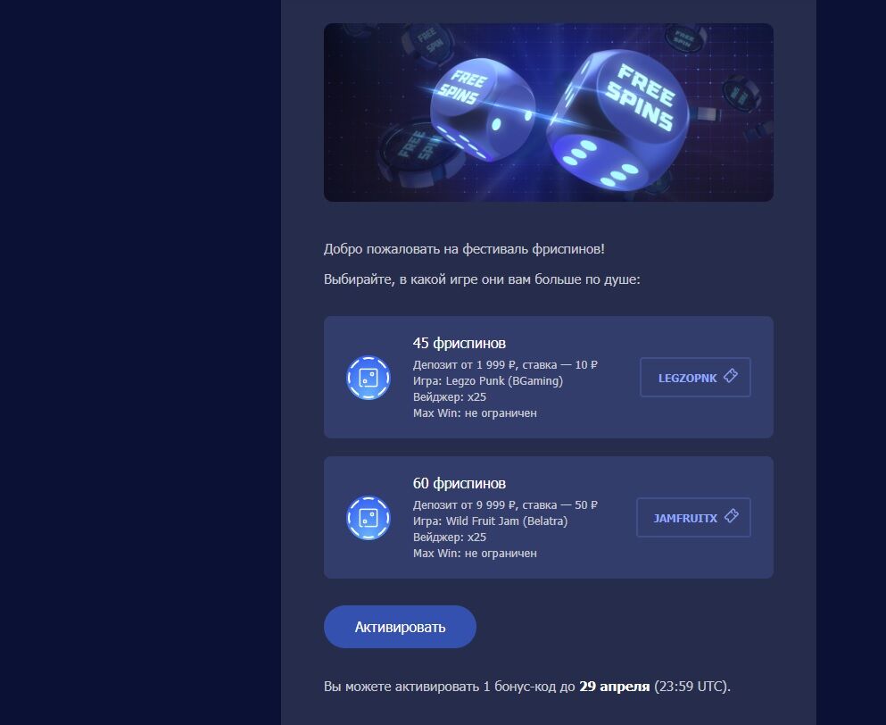 Накинем еще на вентилятор, они кстати агитируют подписывайтесь на наши соц сети итд, чтобы получать информацию о казино и акциях в казино. Вроде здорово и круто, но есть одно но) Пример пришло письмо с фриспинами, смотрим дату до 29 апреля, новость в тг их канале официальном, до 30 апреля. Ты делаешь деп 30 апреля и ничего не получаешь и за обман никто отвечать не будет. Это практикуется во всех казино их сеточки, и никак не пресекается а значит это делается умышленно. Я уже видел жалобы на подобное.