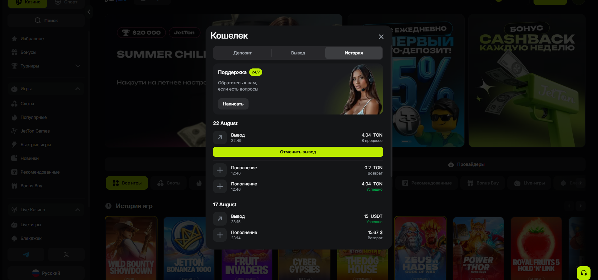 @gans2115 понял, видимо мне значить в последнюю очередь начислили, че то не большой осадочек остался на джеттон хотел вывести пару рублей с призовых 2,5к не играло толком в пятницу ничего ни какие слоты, до рубля тупо слив по минимальной ставке 10р, в спорте на ставках удвоил баланс в итоге 2+ часа висела в процессе заявка на вывод на крипту с возможностью отменой .. ну вечером немного расслабился ) 🍺 отменил как итог слил, а ранее максимум выводили минут за 20-25 , ещё подумал специально крипту выбрал рассчитывал оперативнее вывод обработают чем на пиастрикс, так как опыт был, что на пиастрикс час приблизительно занимало, впринципе всё по регламенту сроки не нарушены да и знаю сам виноват, то что отменил не суть, теперь буду знать и вы имейте ввиду не всегда они оперативно выводят на крипту, хотя снова же до этого выводов хз 3-4 на крипту выводили довольно таки быстро.