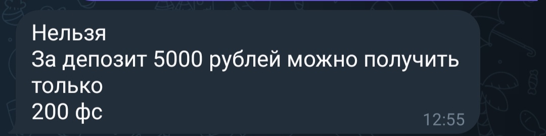 Поэтому рекомендую написать в ТГ-бот Латеса и отметить всё, кроме 200 FS, если депозит только 5 000 рублей