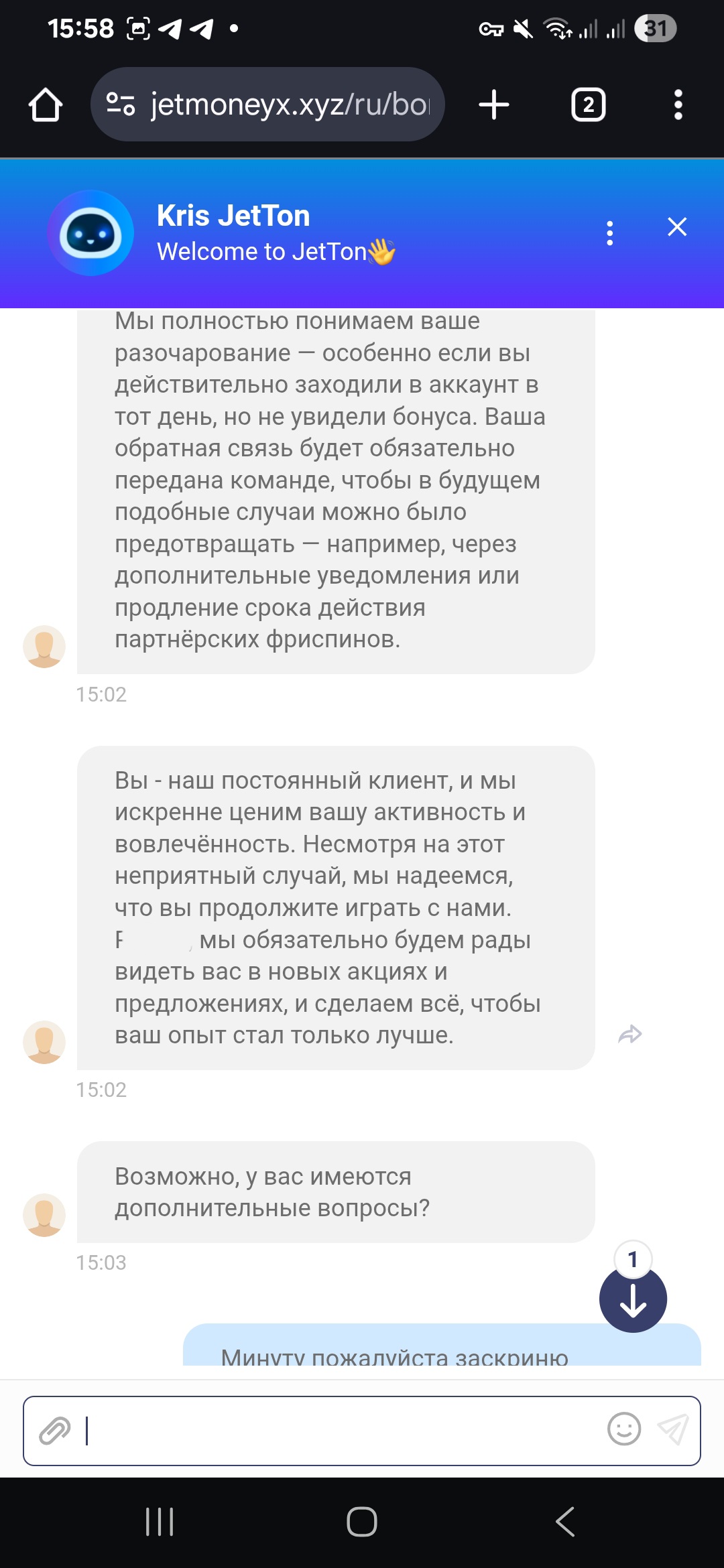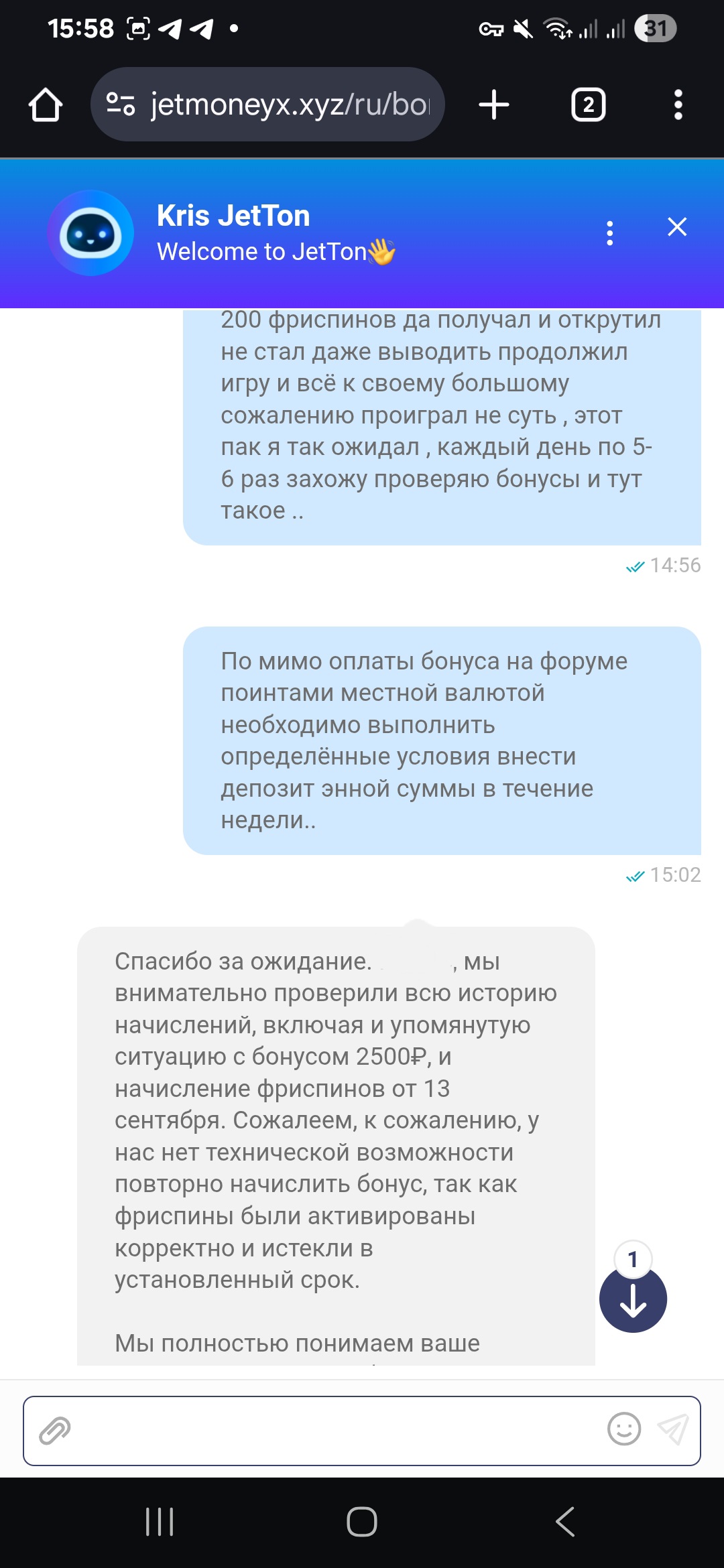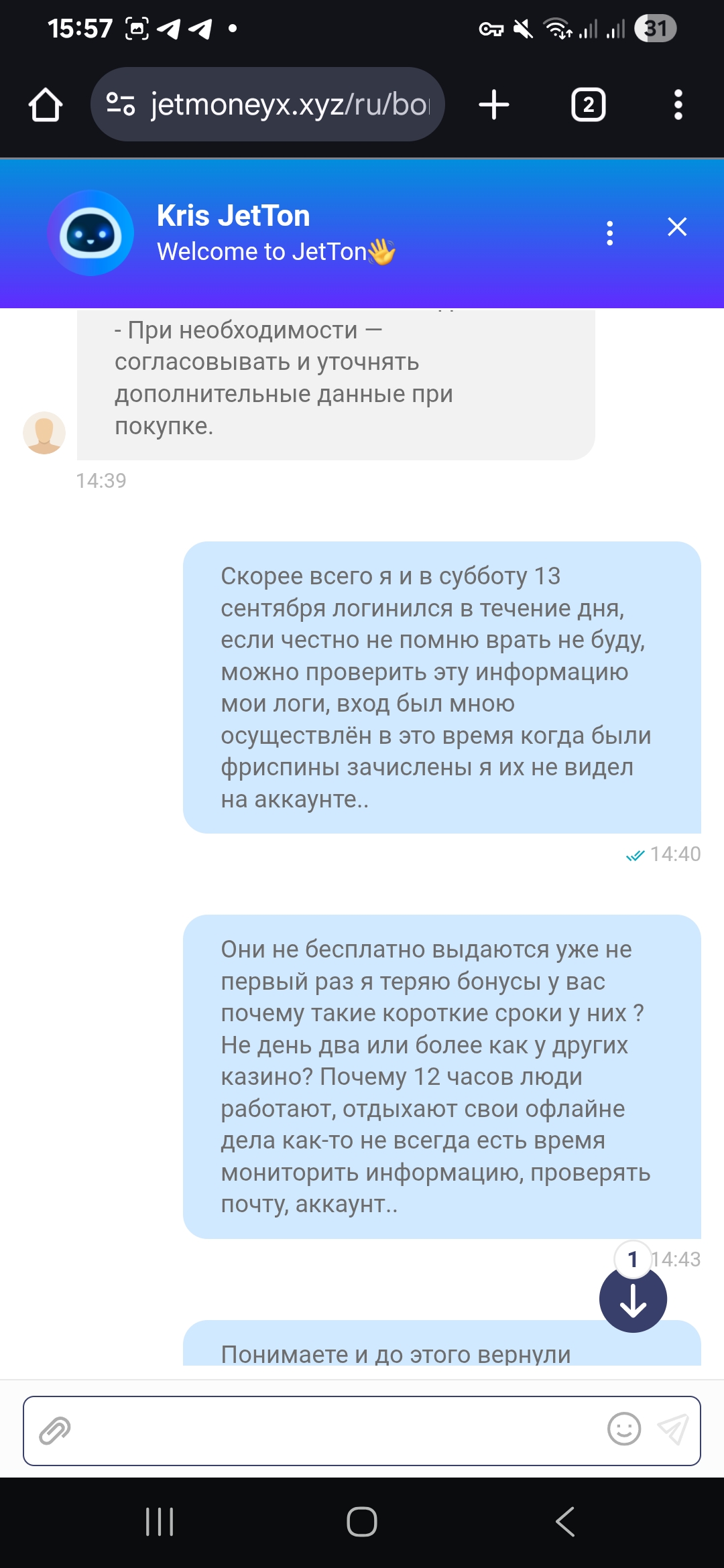 Самое интересное они не дают инфу об твоей активности на сайте, на акке в плане логина когда первый раз «проспал» 2500р кэш бонуса тоже так и не понял в какой день мне из выдали появились сомнения а не в выходные ли дни мне их выдали, так как в рабочие дни до вечера до сна до 22:00 мониторю акк и на мою просьбу проверить дни начисления бонуса и мой вход в казино было вежливо отказано в начале Диана оператор обещала ответить после 5 минут ожидания передала, по тех. причинам покинула диалог и присоединился другой уже сотрудник и так же по тех.причинам они не смогли ответить на мой вопрос, далее на мою просьбу об перевыдачи фриспинов так же вы не поверите снова ))) ссылаясь на технические же технической )) возможности не могут переначислить фриспины, бонусы на акк )))) Просто как с маленьким ребёнком общаются да бла бла мы всё пониманием нам рчень жаль , вы наш постоянный игрок, примим к сведению , передадим инфу Европе одна вода а помощи, лояльности 0 в этом плане …