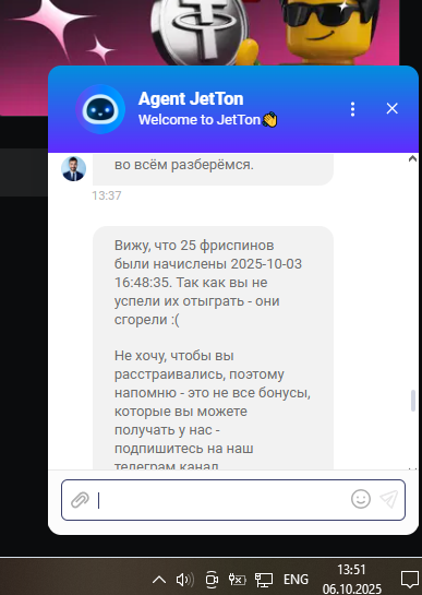 @zamo4ek16 понятно как у меня, только тебе их в пятницу получается зачислили, а мне в субботу ( но сути не меняет 12 часов это очень мало) когда я и не ждал начисления, так как в выходные ни одно казино не выдавало фриспины, бонусы, форум администрация, сотрудники отдыхают как и я раньше думал менеджеры казино + ко всему нет возможности привязать, подключить тг и почту ..