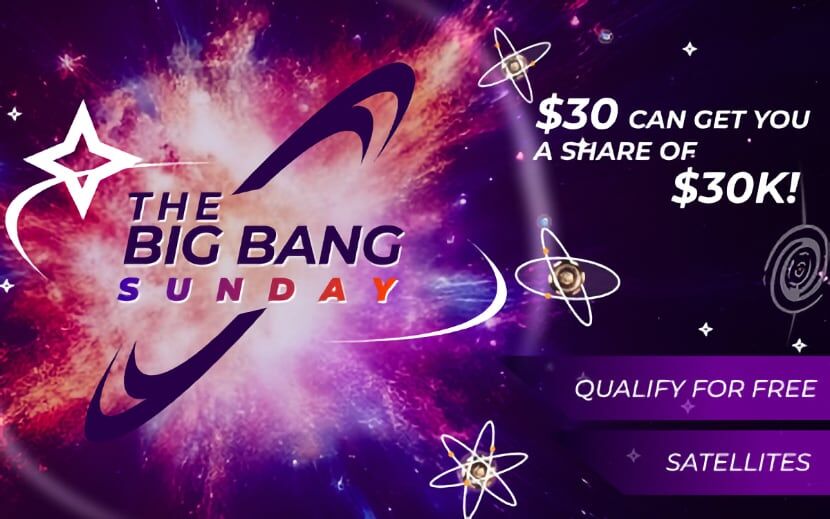 В первое воскресенье каждого месяца будет проводиться новый турнир с призовым фондом в $30,000 всего за $30 прямого бай-ина. Более того, есть возможность пройти квалификацию бесплатно! За неделю до турнира проводятся сателлиты, и можно выиграть билеты на сателлиты или турнир Big Bang Sunday в одном из фрироллов.