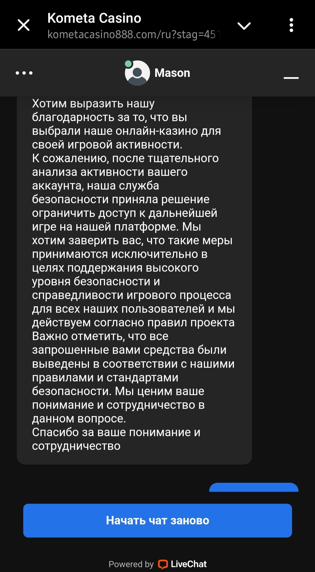 Казино «Комета» в очередной раз показало свою нечестность. Если вы планируете там играть, будьте готовы к неприятным сюрпризам. В один момент ваш аккаунт могут просто заблокировать без объяснений, даже если вы лояльный игрок.