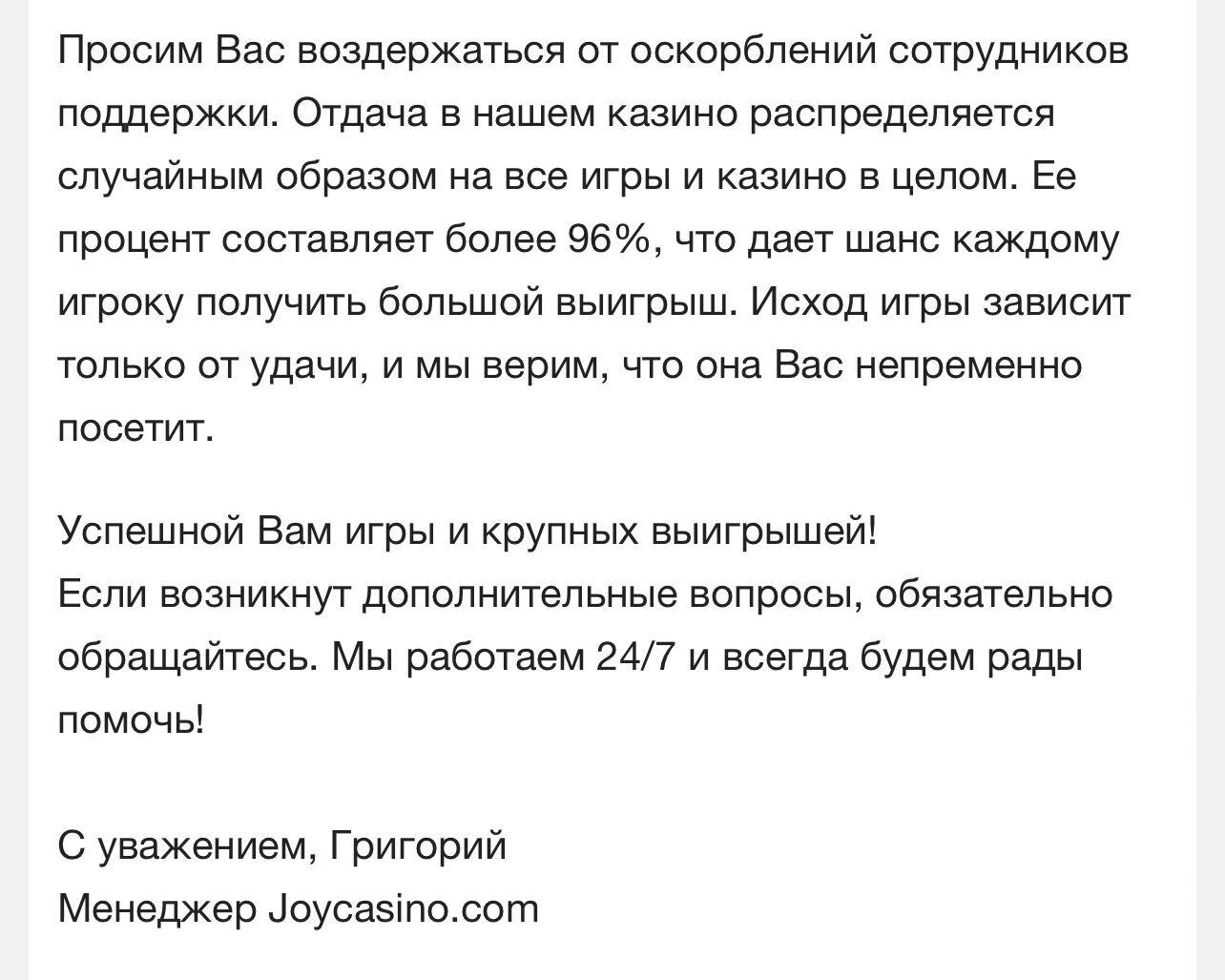 Увидел на форуме скрин человека, где ему менеджер джоя Григорий утверждает, что в их казино РТП составляет 96% и больше. (скрин приложу)
