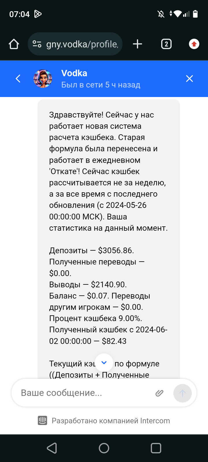 Предыстория: в казино водка кеш бек в субботу, вчера было воскресенье. Я немного подзалился, и перед очередным додепом увидел, что сумма моего кешбека 0, вместо положенных 9%.