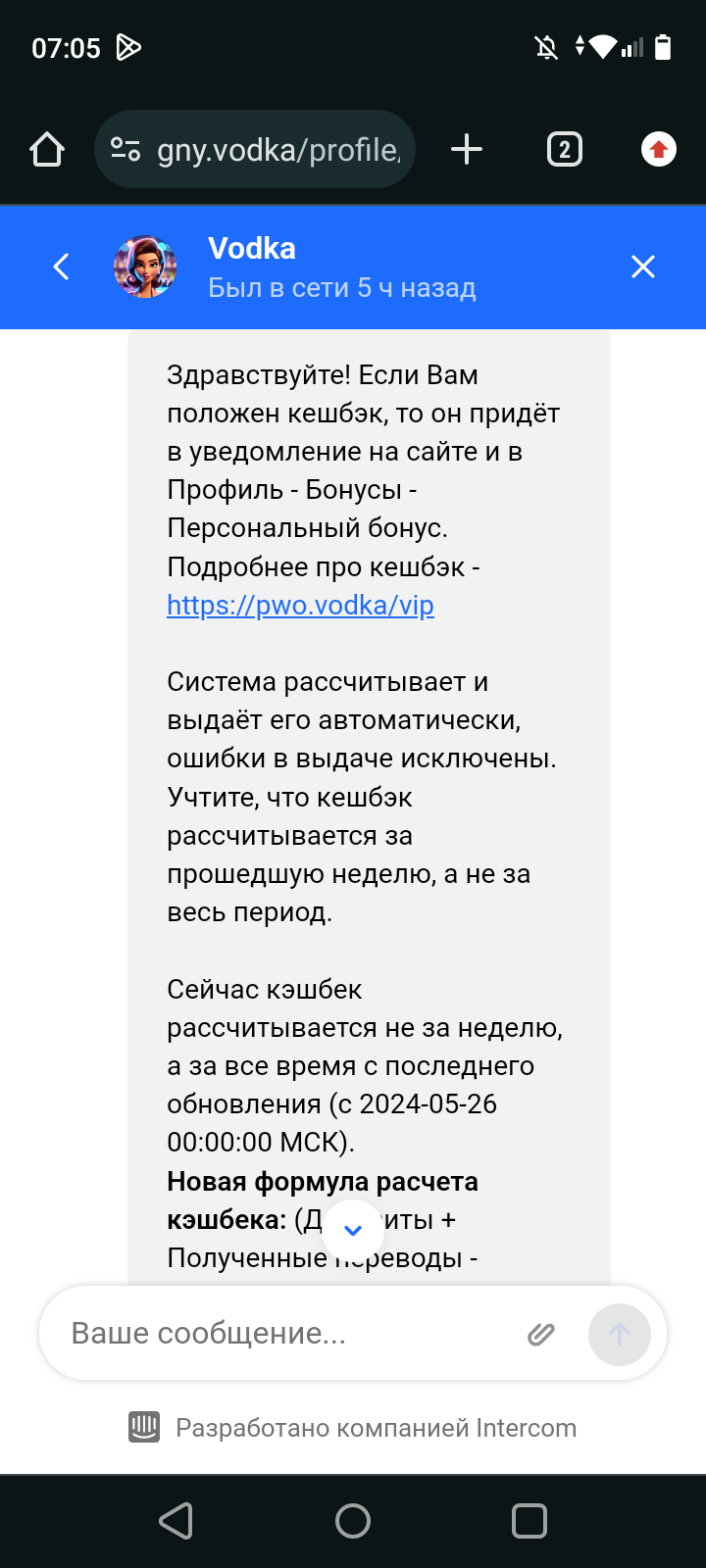 Итак что мы имеем? Кэшбек у нас отжали, Персональный бонус так -же работает плохо( за слив баксов 500 мб дадут вам 50 центов а то и баксик что наврятли) появился супер не суперский откат копеешный и раз в недельку дают рандомно от двух до 16 спинов (причем что депал 50к+ дали 8 спинов что депал 7к за неделю дали 16 , не понятно как там работает вообще) Еще ртп низкое в некоторых слотах) последний РЕАЛЬНЫЙ оплот это бонус от латеста , но я думаю и тут прикроют лавочку друзья! На самом деле водка одно из самых быстро скатываемых казино, не в плане выводов и тд а в плане лояльности к клиентам! Даже роялы скатывались не так быстро, а только гдето после сола начали скатываться, или джета.