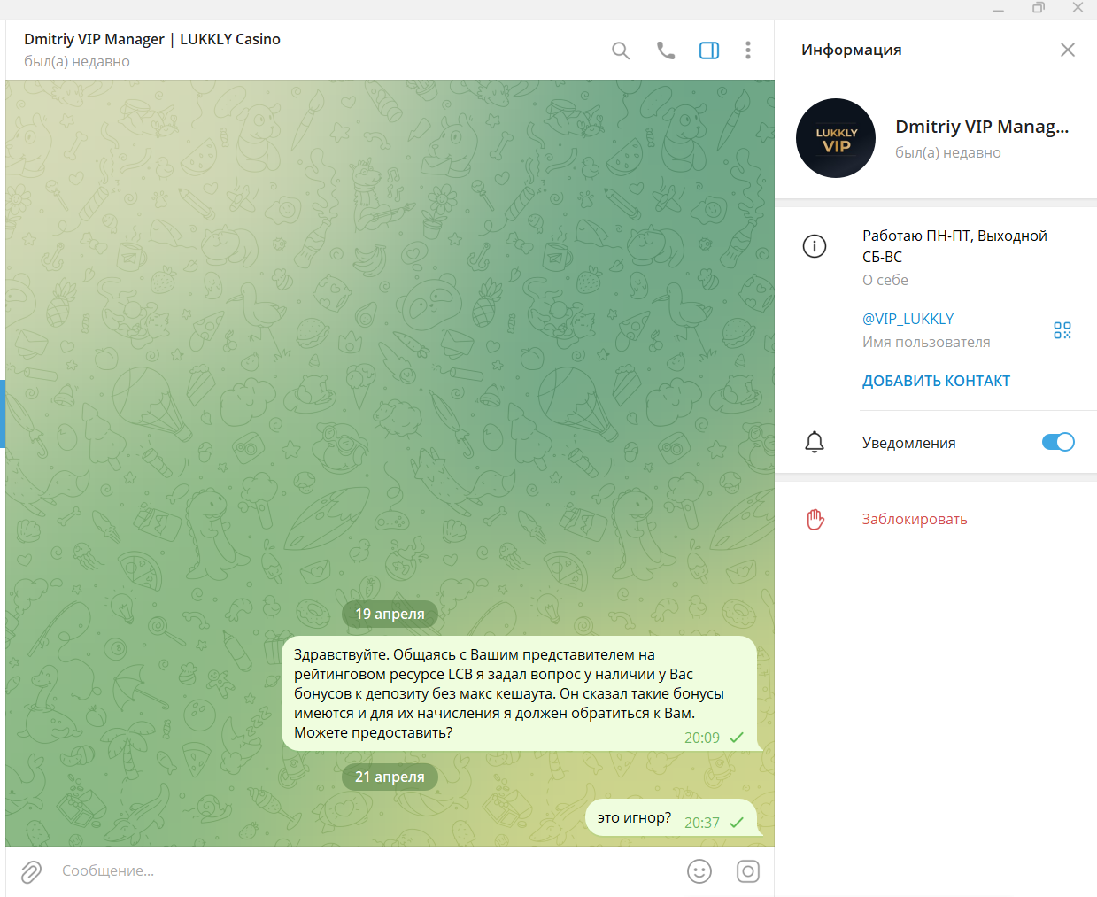 Ваши слова: у Вас есть бонусы без х10 к депозиту, для этого нужно обратиться в чат! Обратился — в чате не…, впервые слышу. Могу рассказать про бонусы в вашем профиле)) Я говорю: А зачем Ваш представитель на рейтинговом ресурсе LCB обещаниями разбрасывается?! В чате: А, да…, вот контакт в телеграмме нашего менеджера — обратитесь к нему. Обратился — тишина, даже не прочитана)))