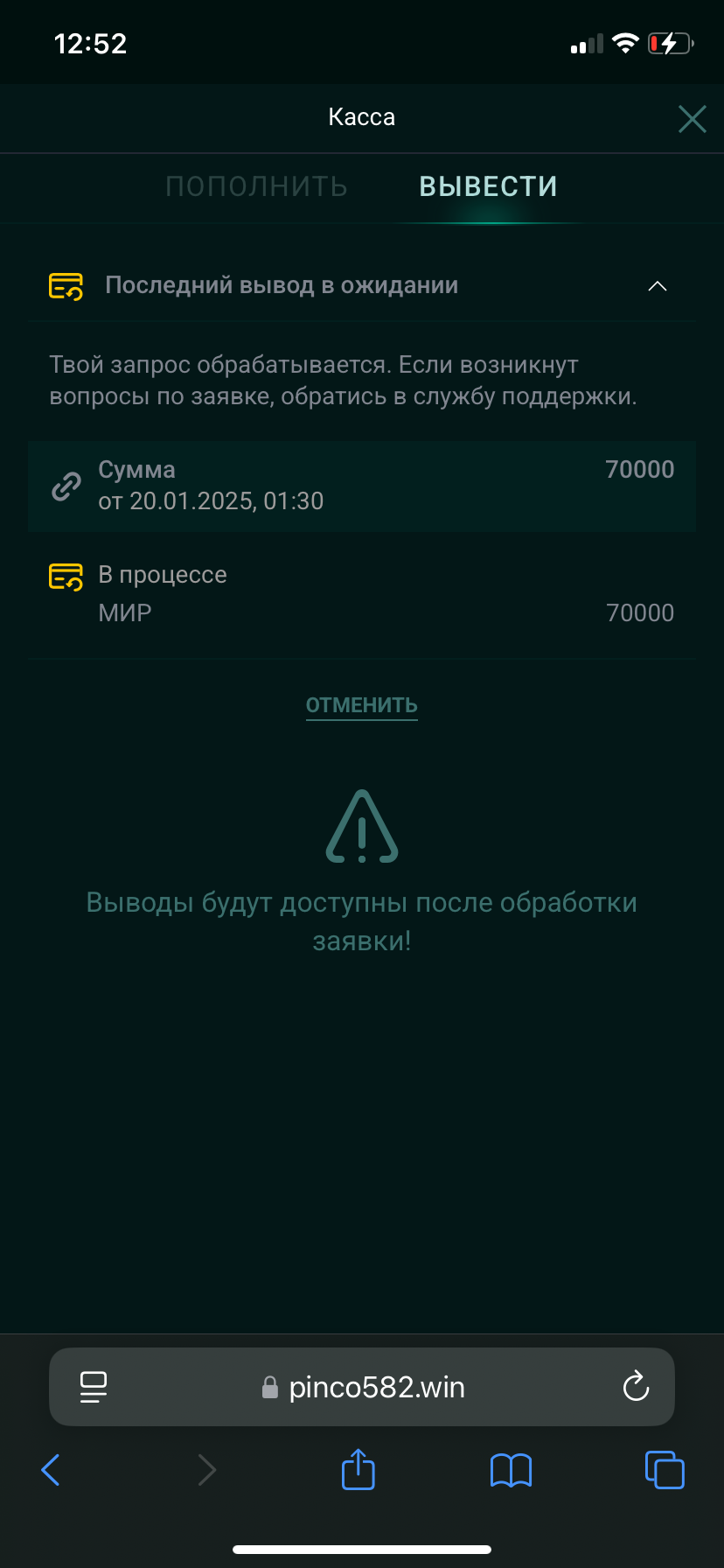 Поставила сутки назад деньги на вывод в пинко, они до сих пор не пришли, поддержка не отвечает, что делать, ждать дальше бессмысленно, отменить вывод тоже невозможно