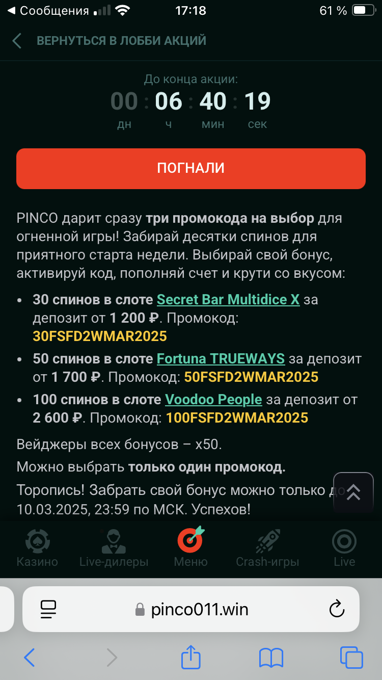 Понял ,спасибо! Значит попробую зайти глянуть что и как, мне бонусы не липкие нравились в пин апе очень и эти квизы тоже.