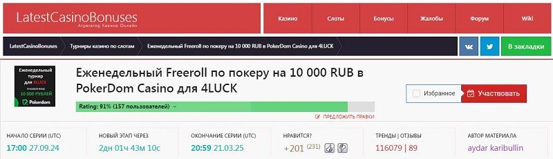 …LatestCasinoBonuses совместно с PokerDom проводит еженедельный бесплатный турнир по покеру.