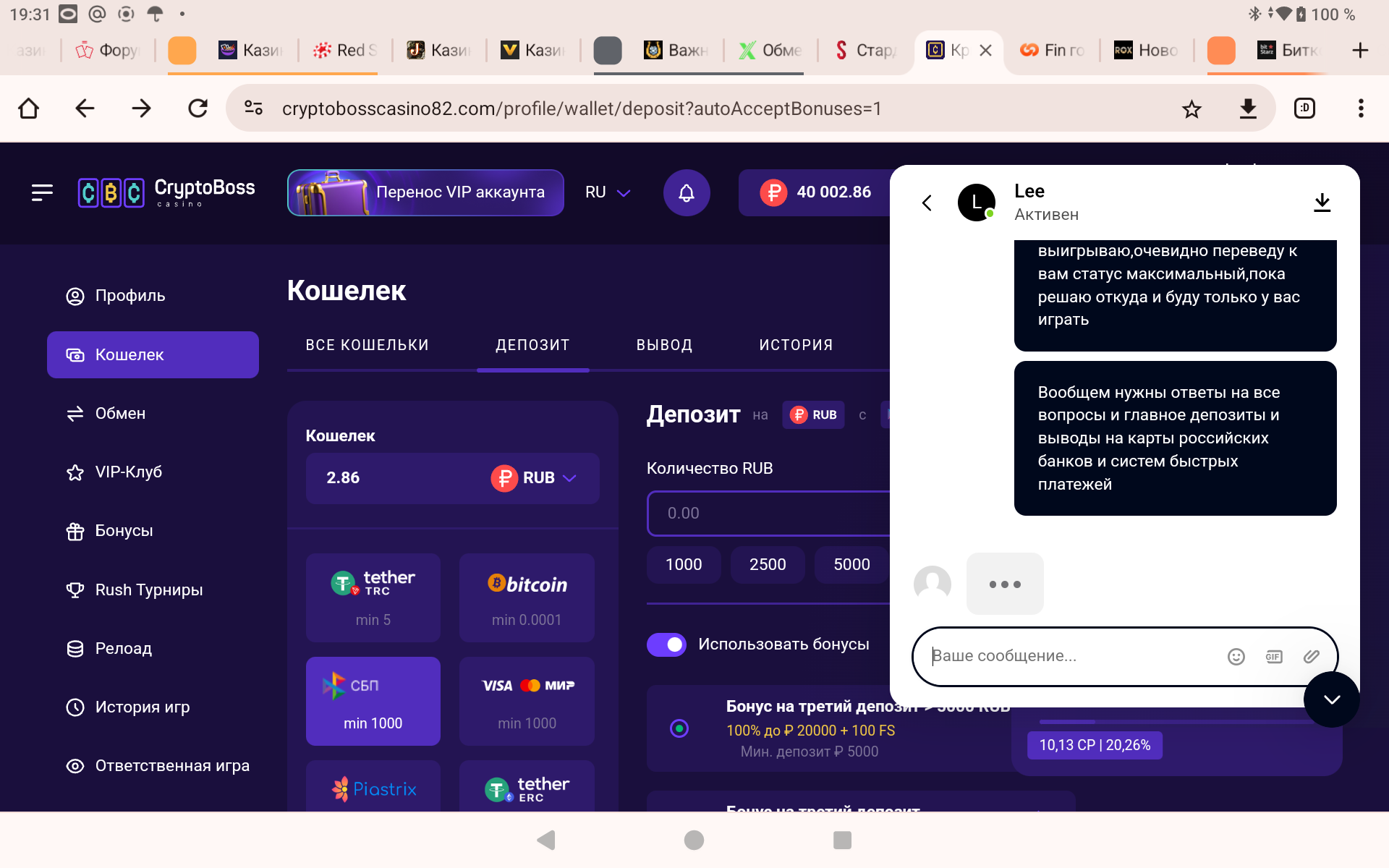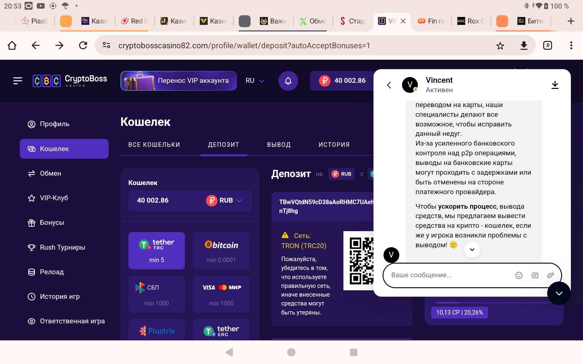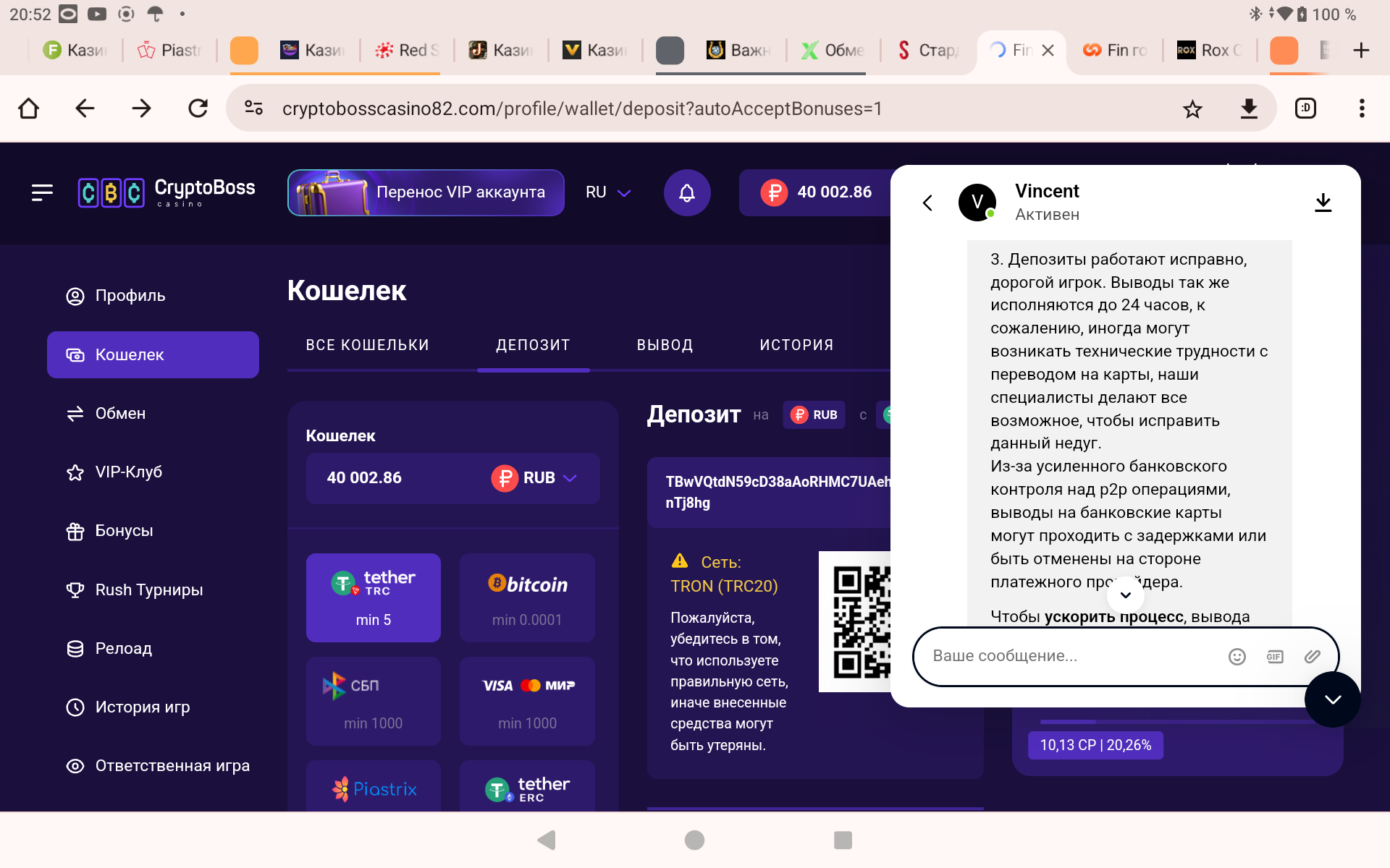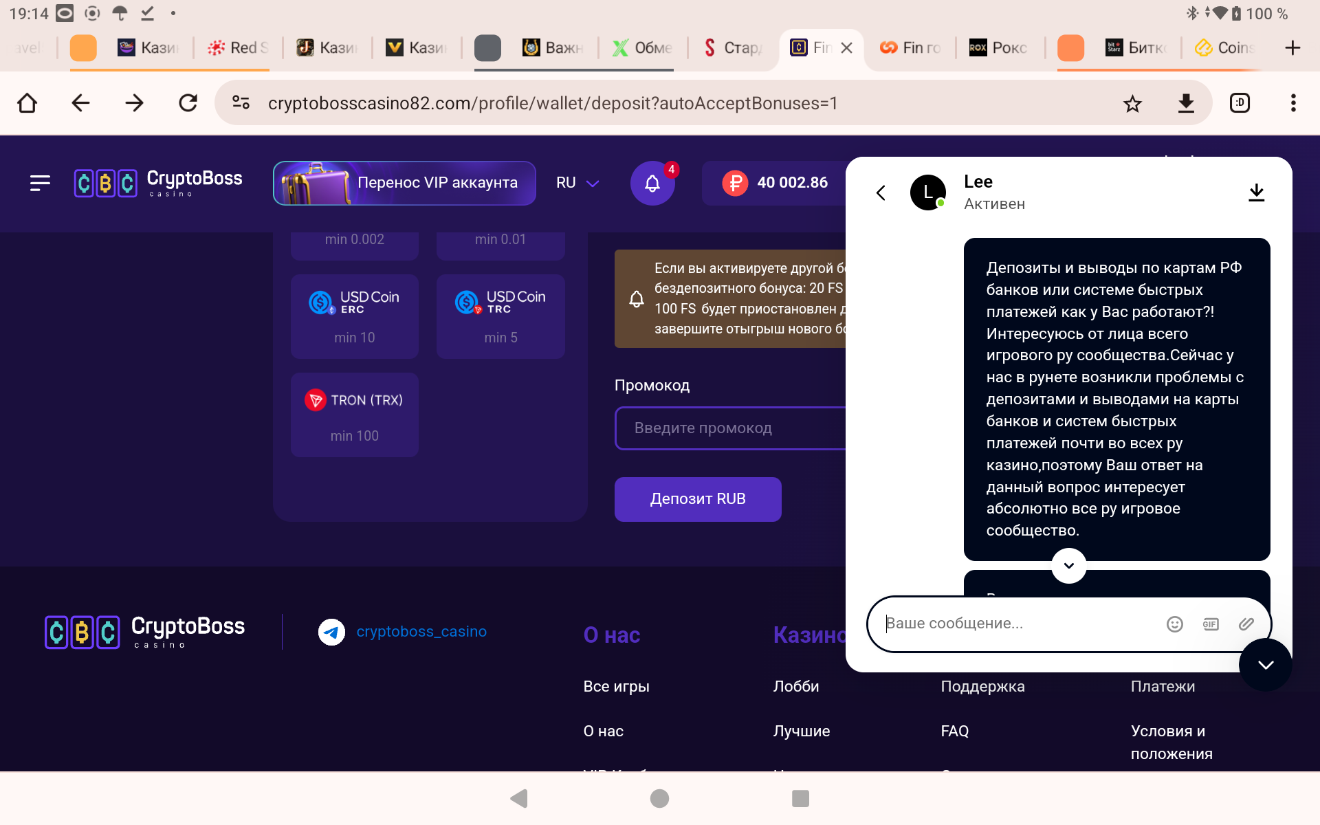 Ка видишь задержки именно из за новой работы и правил нашего ЦБ с 25 ого числа прошлого месяца,когда ужесточили именно p2p переводы,что и подтвердили сотрудники криптобосса,а до них и остальные кази и платёжки,а у них реально очень высокий уровень подхода к консультациям,я за это могу ручаться,(к слову по моему скромному опыту только в Битстарзе и Криптобоссе максимально высокий уровень сапорта,технической поддержки от сотрудников казино,можете мне на слово поверить,я знаю,что говорю)не знаю как в других,ан лиме или ауфе или или ,я про криптобосс именно говорю,я у них играю,зашёл депнул,заодно уточнил для всех нас,он их флагман и тут все круто по консультациям,именно индивидуальный подход.Вообщем все упирается в новые правила работы банков как и следовало этого ожидать,я повторюсь.Но они работают с нашими картами и p2p переводами ,а это главное,что нам нужно было знать.