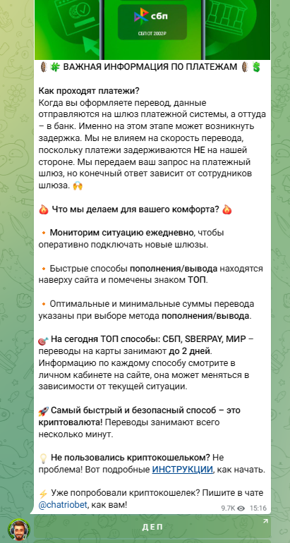 За последние недели пару раз в других казино терялся деп через СБП,в обоих случаях после загрузки чека бабки упали на счет в течении 1-2 часов.