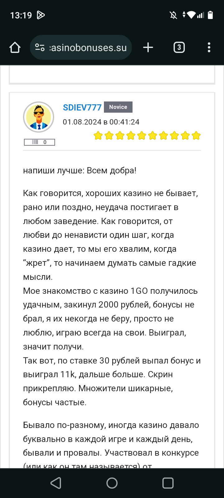 У данного пользователя есть еще отзыв и на другое казино. Не замечен как бот! Видимо форум посещает чисто чтобы почитать отзывы игроков о казино!