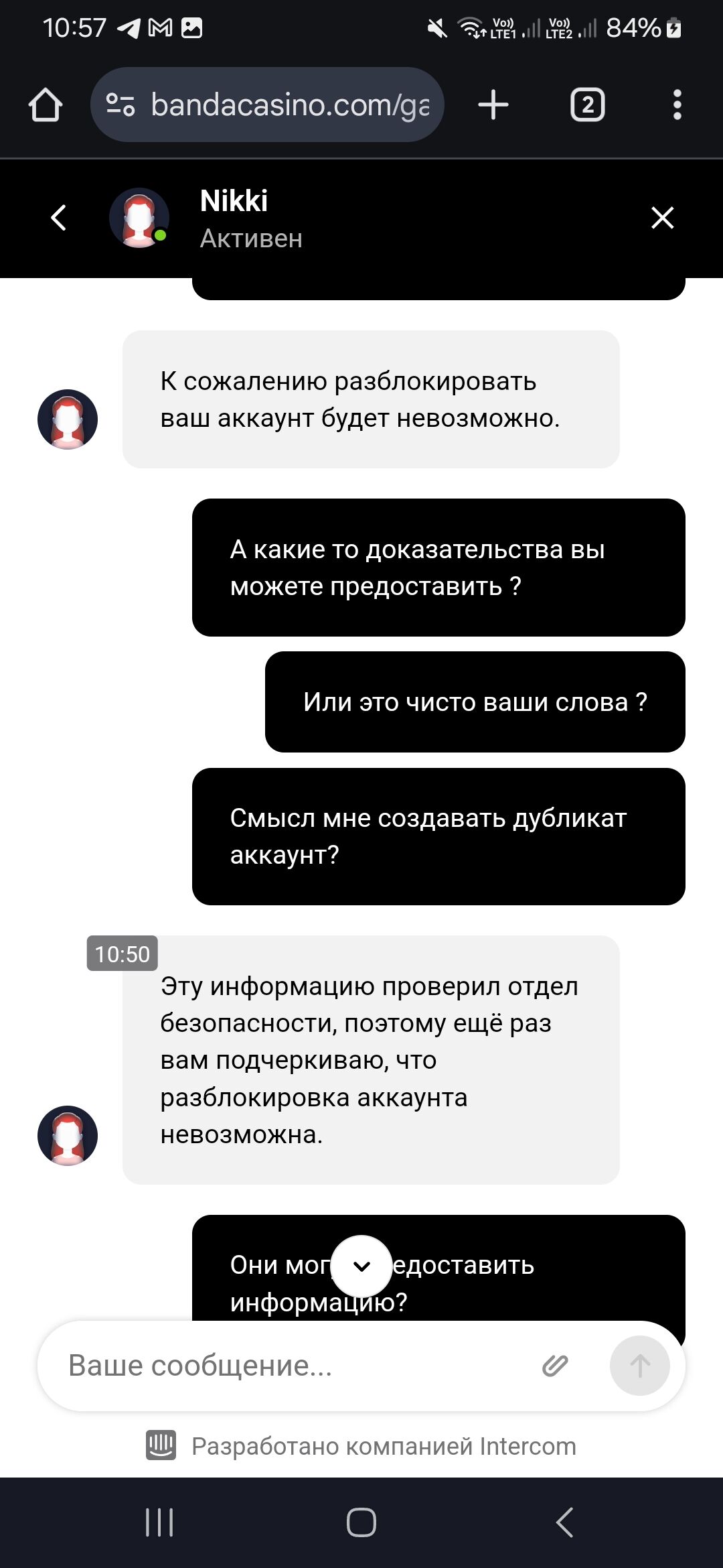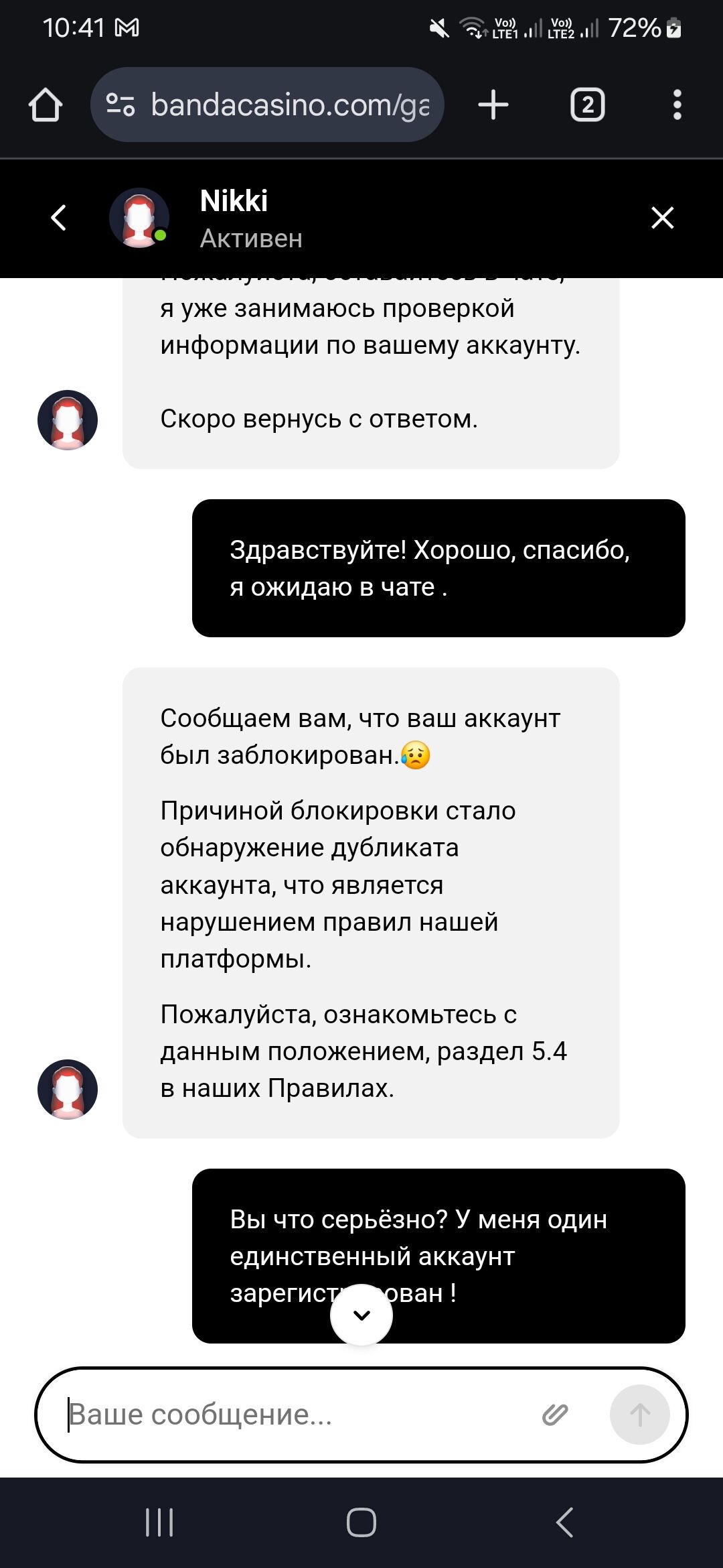 Согласен на 100%, хорошо хоть все это произошло на старте, деп не успел совершить, занёс бы чего и запарился бы им что-то доказывать, попросил какие-то пруфы, информацию передоставить по «дубликату» ничего нет тупо ссылаются на СБ по их информации у меня якобы дубль, ни почты, ничего не предоставили. Словесно обвинили в том, чего нет и мне при этом бить себя в грудь и доказывать что нет дубликатов при том мягка сказать не самое топ казино + со всеми его минусами это они должны удерживать, держаться за каждого игрока, клиента ну — минус один постоянный клиент )
