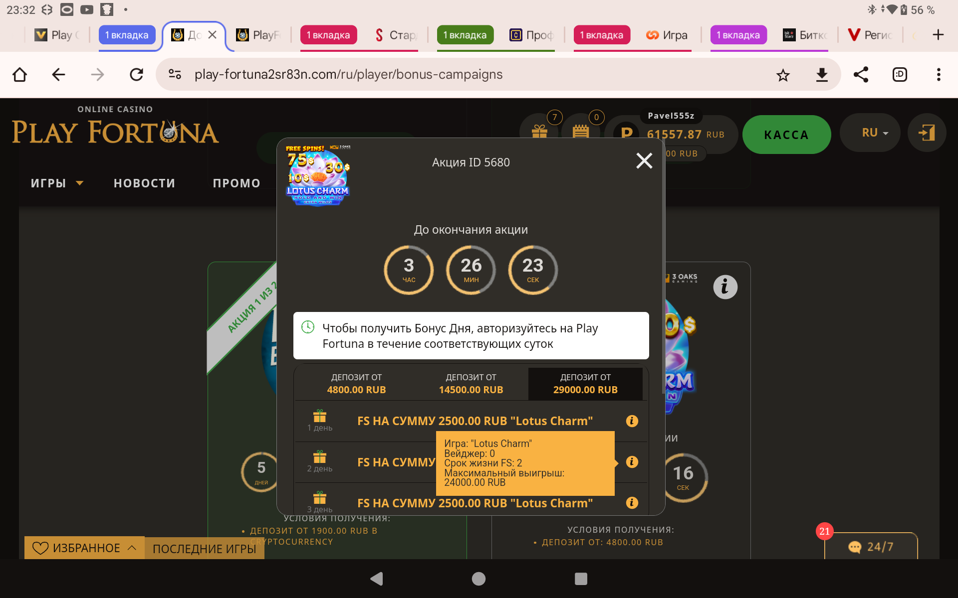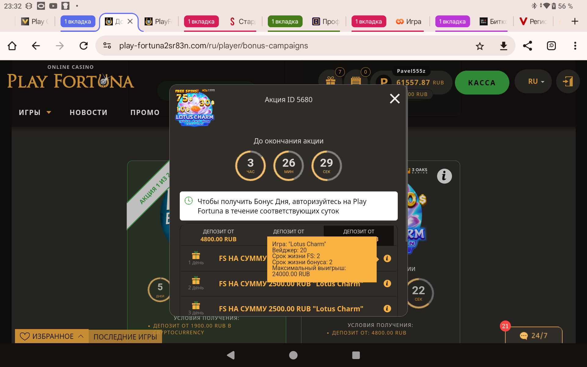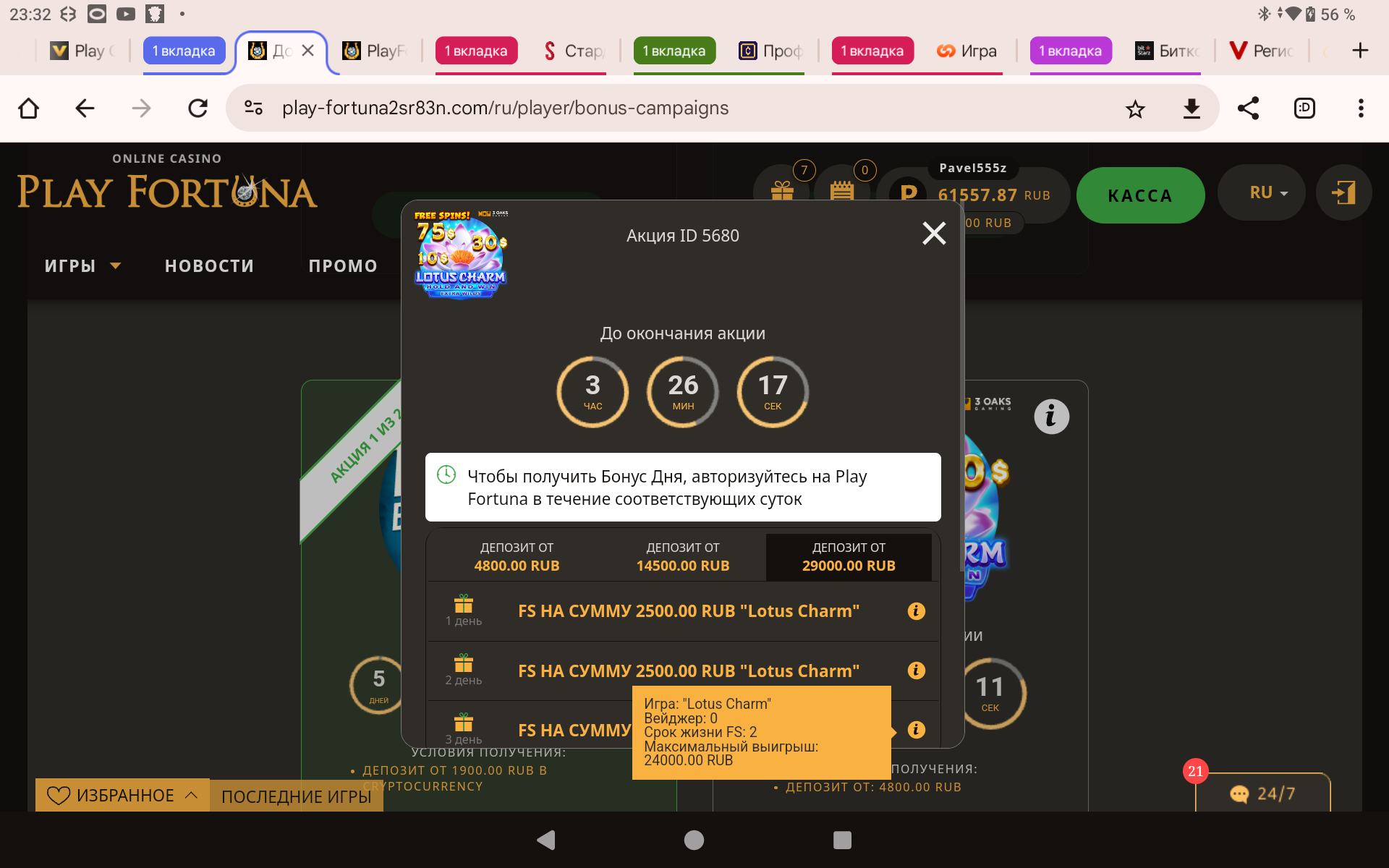 Я щас в Плейфортуну опять депну под очередную акцию.2500 рублей на фриспины дают за деп в тридцатку почти,там потом выбираешь в слоте 3oaks по сколько и сколько фриспинов крутить,я всегда 25 фриспинов по 100 р ставлю и всем советую и без Макс Вина и без ограничений!!!А нет сегодня с Вагером на 20 в первый день,а остальные два дня вообще без Вагнера, но это все равно ничто ,ни о чем я считаю,я раз из двух его за три часа откручиваю в касание в пф