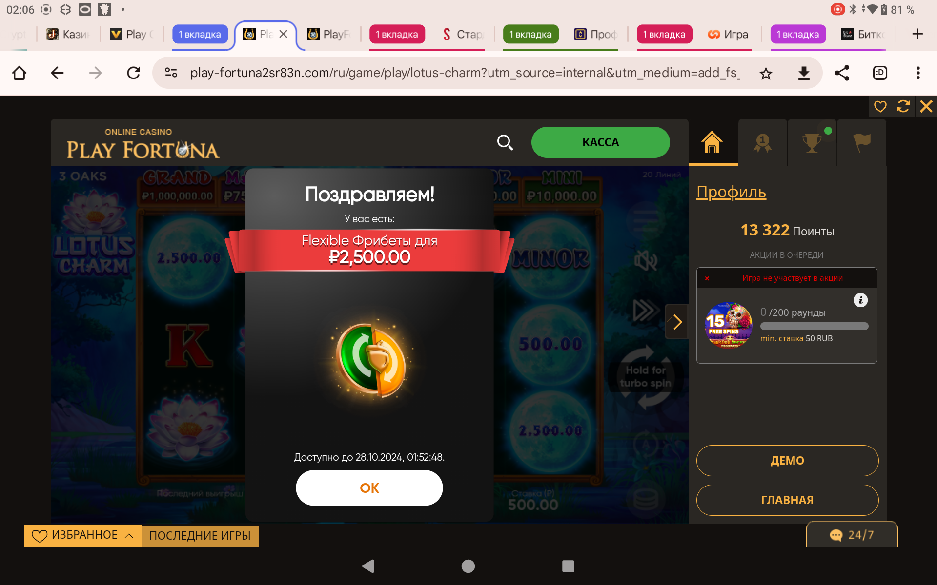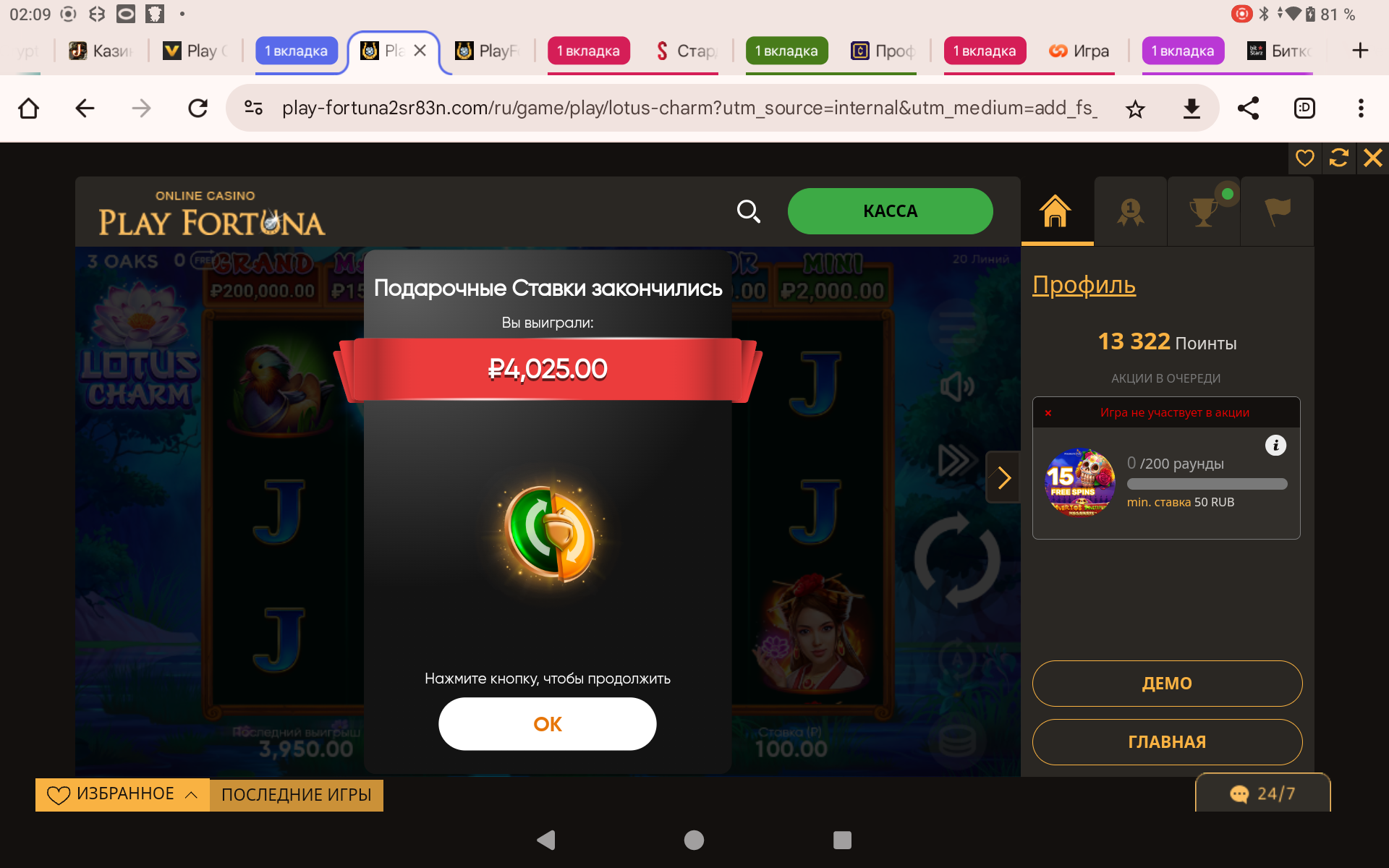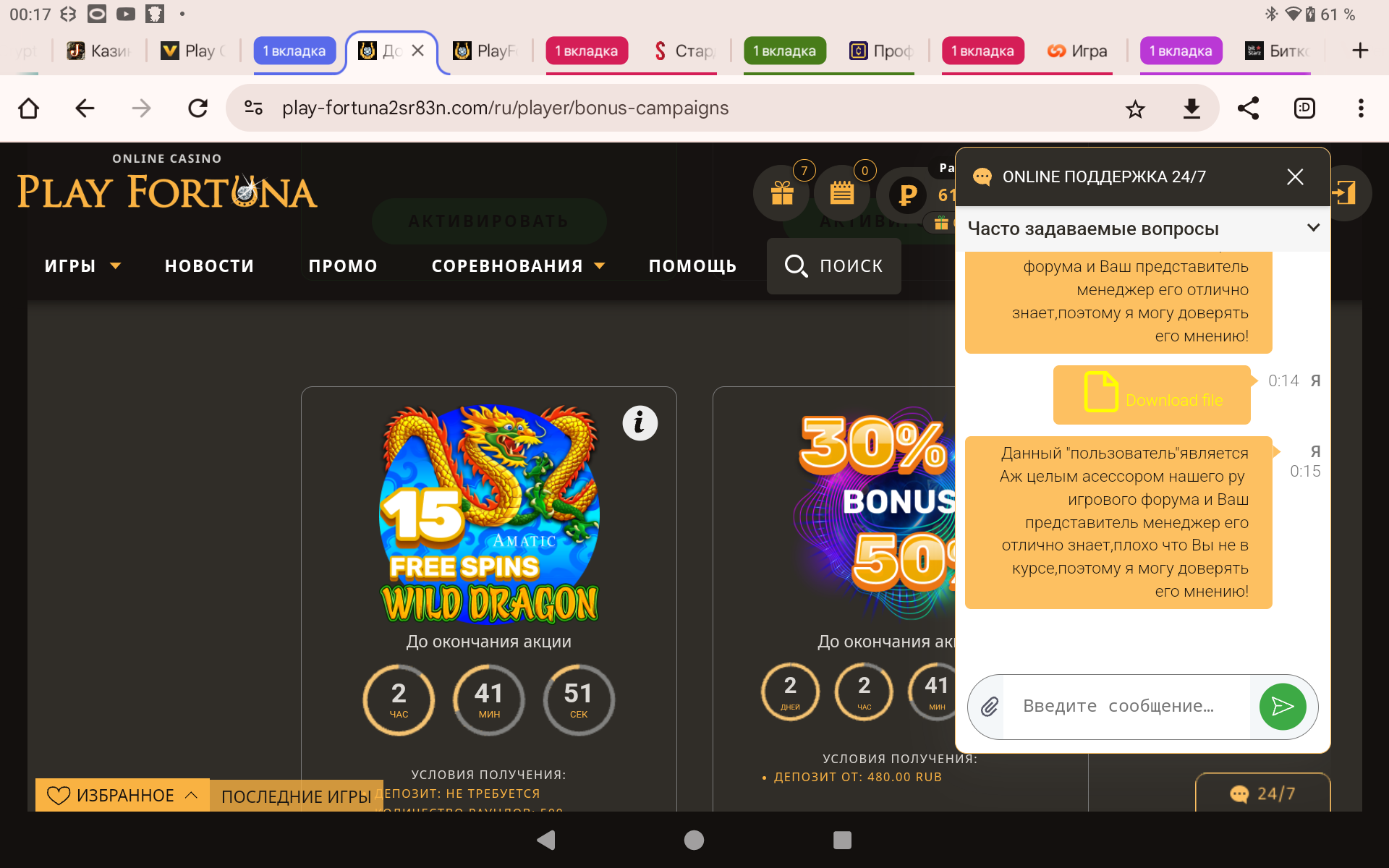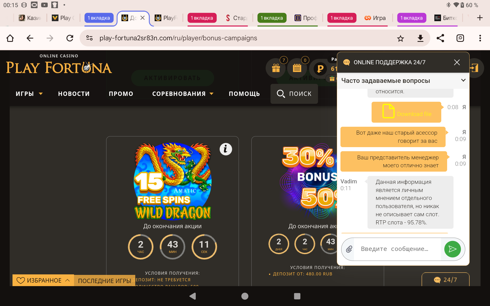 Я щас в Плейфортуну опять депну под очередную акцию.2500 рублей на фриспины дают за деп в тридцатку почти,там потом выбираешь в слоте 3oaks по сколько и сколько фриспинов крутить,я всегда 25 фриспинов по 100 р ставлю и всем советую и без Макс Вина и без ограничений!!!А нет сегодня с Вагером на 20 в первый день,а остальные два дня вообще без Вагнера, но это все равно ничто ,ни о чем я считаю,я раз из двух его за три часа откручиваю в касание в пф