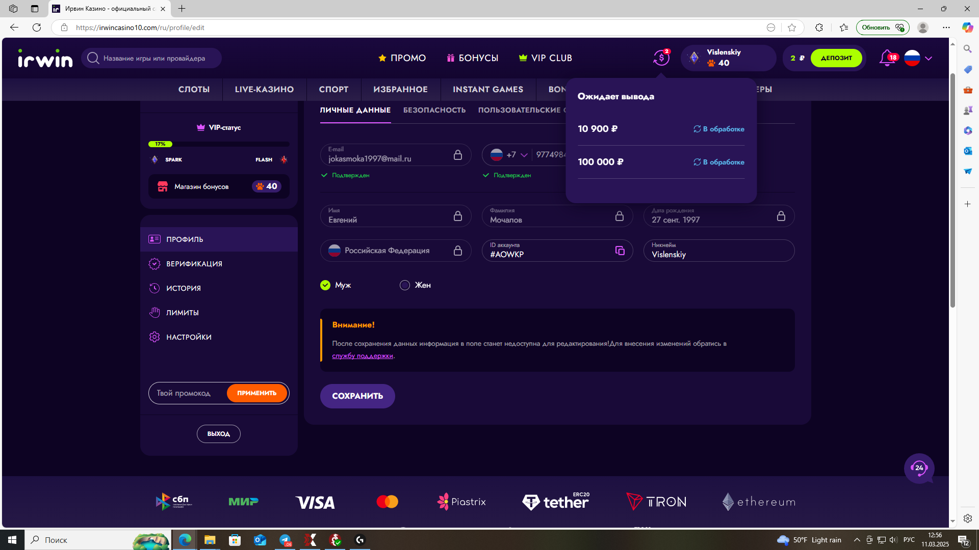 Здравствуйте,помогите пожалуйста поставил деньги на вывод в казино IRWIN нет вывода отвечают шаблонно,что мол проблемы на стороне платёжной системы,мало того,что не вывели так ещё и мой первый депозит тоже не дошёл.Помогите пожалуйста