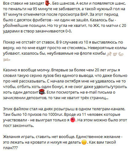 Ещё в конце 2023 года я опубликовал в своём телеграмм-канале пост про чёрную полосу в лудке. Если раньше проигрывался полностью в казино, то спасали заносы в покер. Если ривер всегда ложился не в мою пользу, то футбольные боги были на моей стороне, помогая заносить невероятные экспрессы. А тут прям последних три месяца 2023-го года — везде и всё в минус.