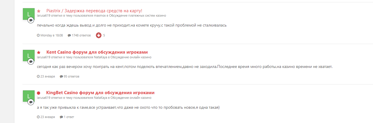 я уже обьяснил почему в боты записали, возможно увидели хвалебные отзывы на сетку + мало сообщений и относительно недавняя рега . И Повторюсь таких как Лариса тут было уже много, я даже скинул вам её ВСЕ сообщения и везде написан полу копипастный бред. Одно время нас атаковали подобные с сетки роялов , залетали такие и писали какие роялы (сол фреш рокс и тд и тп) крутые, и тоже было по 5-10 сообщений И НЕ ОДНОГО сообщения без упоминания какого либо казинака с их стороны.. а сейчас последние персонажи котов пиарят. Понятно что есть и те кто на радостях (возможно занесли и вывели быстро) бегают и кричат везде какой казик классный.. так сказать дофамин сработал… но там же должно быть хоть одно другое сообщение? )