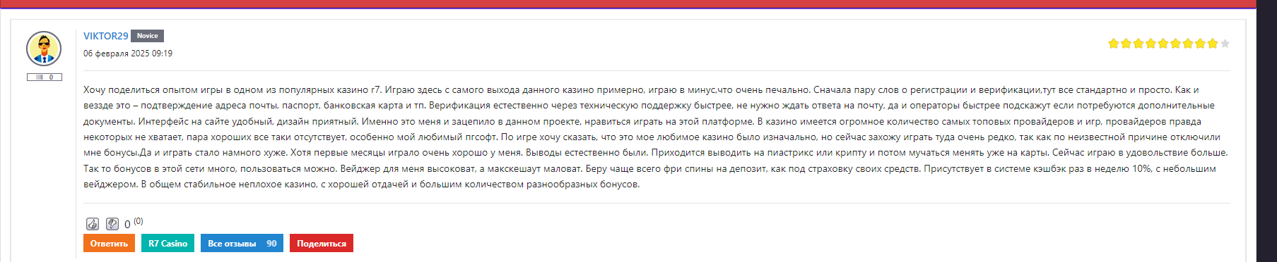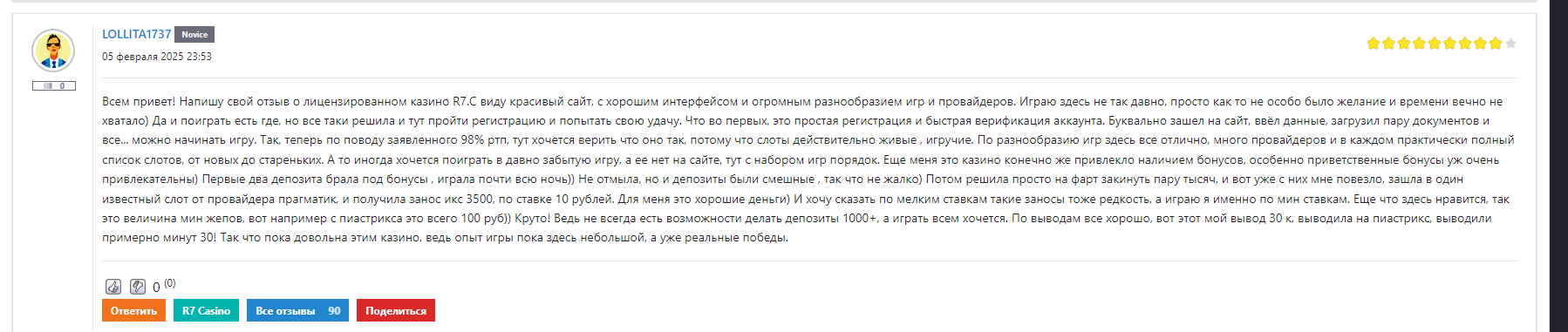 На скринах пример, рега 4 числа, отзыв 6 числа сразу именно на ваше казино. Другой рега 29 января, отзыв 6 числа и сразу же на р7. Совпадение? Не думаю.