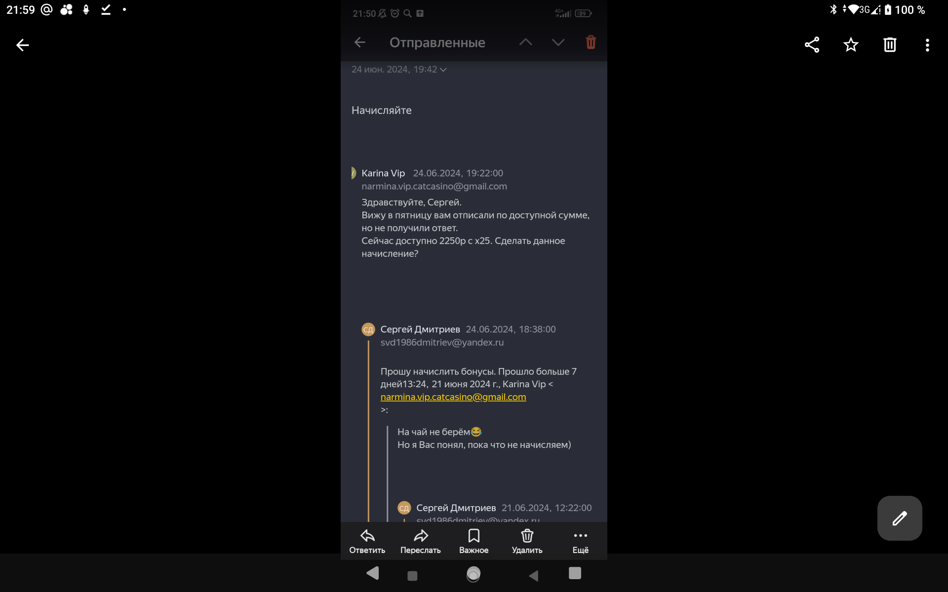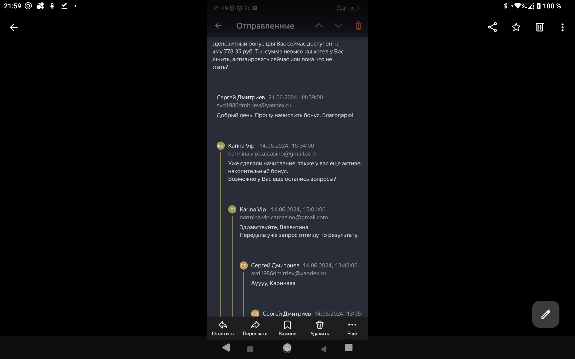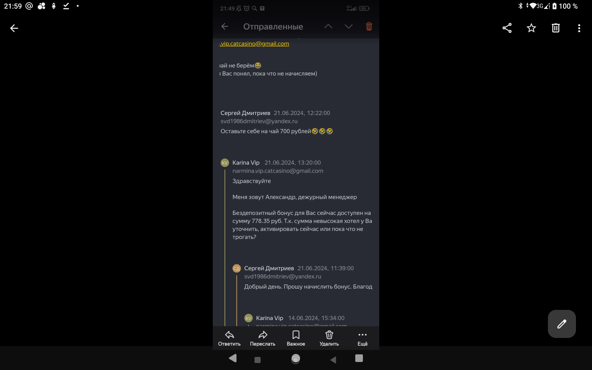 2) не было никакого звонка от сына в казино с целью дать бездеп, было письмо на почте. На скринах это просматривается, как и на самих ответах, не понятно, кто отвечал и т.д, опять догадки от котов.Пусть казино предоставить доказательства этого звонка если он есть у них в записи ,а не сочиняет!!Но у них нет этой записи в принципе ,иначе бы предоставили 💯.